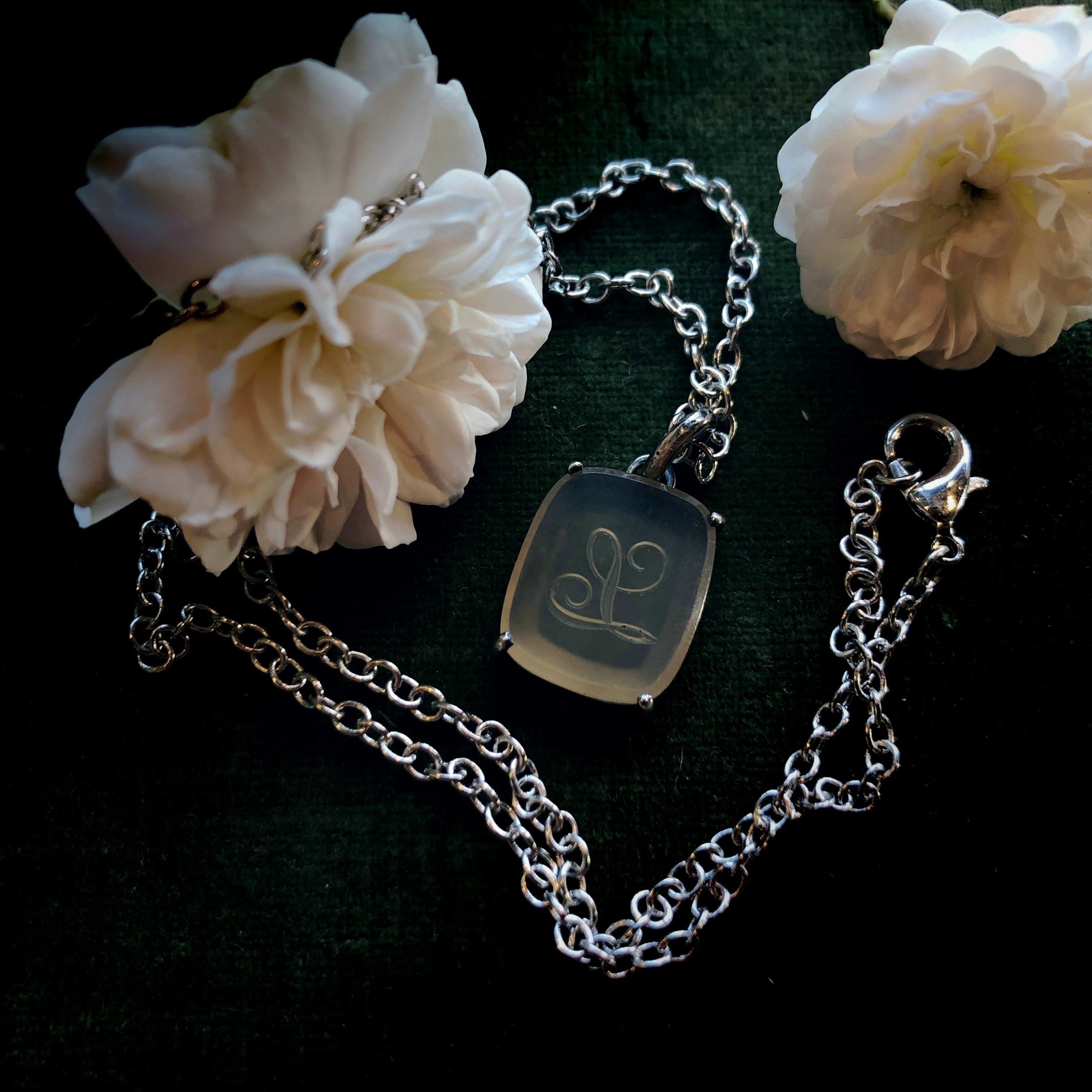 半透明乳白色の、おそらくカルセドニーに "L" の文字が流麗な書体で彫られています。カルセドニーは石英の細かい結晶が緻密に集まって形成された鉱物で、柔らかく上品な質感です。
