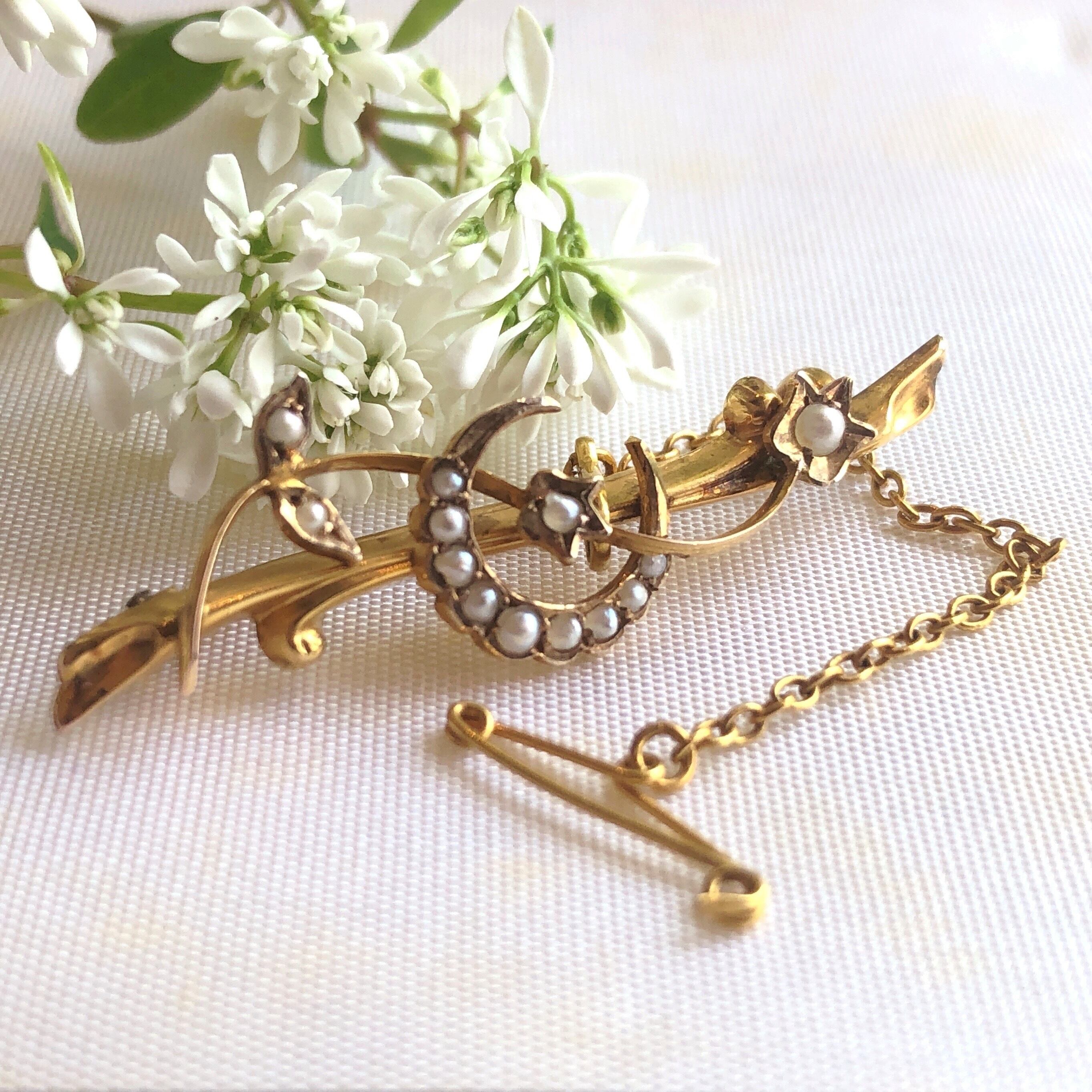三日月に小花を一輪あしらい、繊細さの内に生き生きとした愛らしさを秘めたブローチです。左右非対称の意匠からは柔らかく軽やかな動きを感じます。各所にシードパールを置き、素材は9カラットの金です。