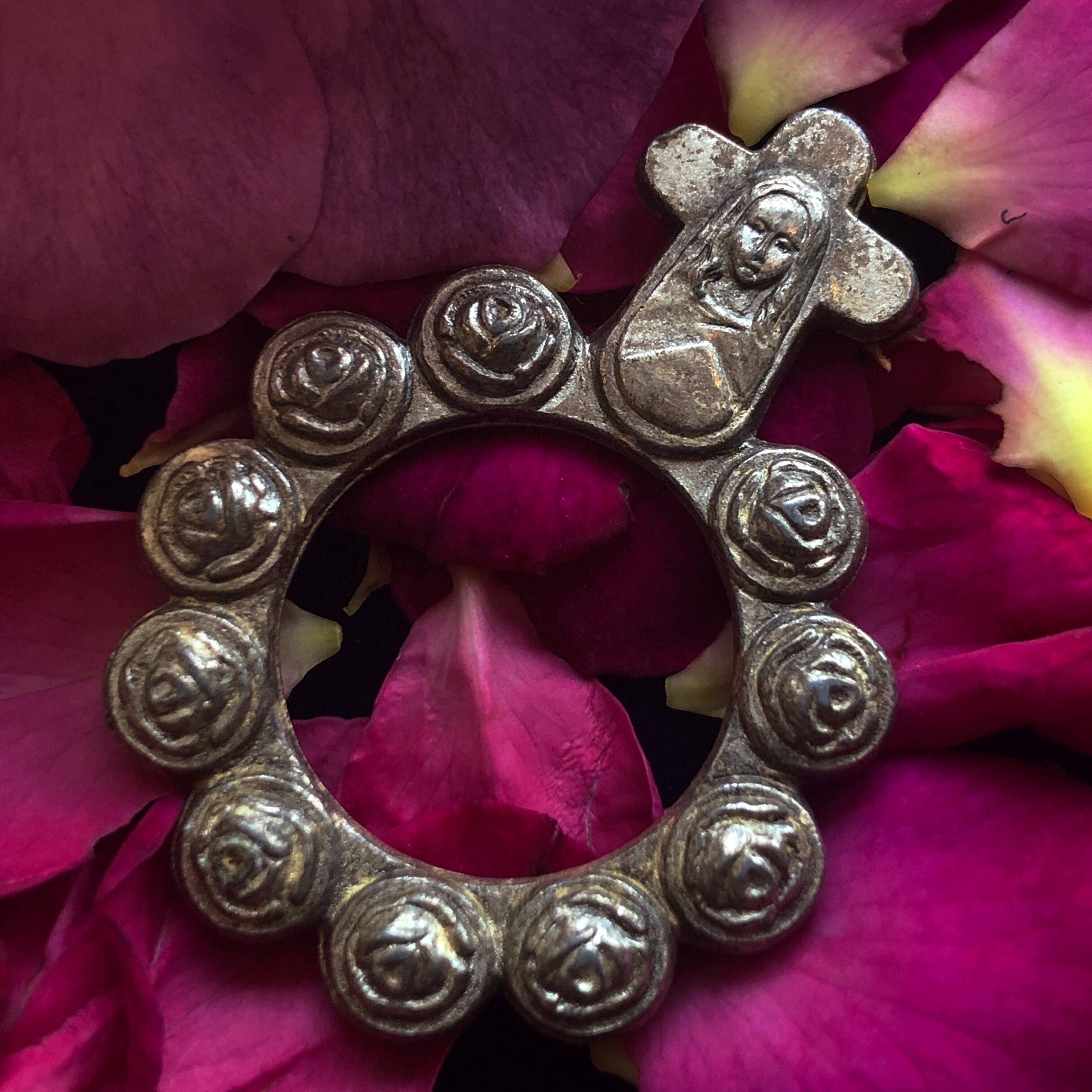この指ロザリオは、十字架部分に小さなイエス像があり、ロザリオの周囲に"AVE MARIA"の文字が彫られています。また、反対側にはマリア様のお顔があり、周囲の突起にはひとつずつ薔薇の花があります。古色を帯び素朴な印象のお品ですが、様々な想いを込めて細かく凝った意匠になっています。