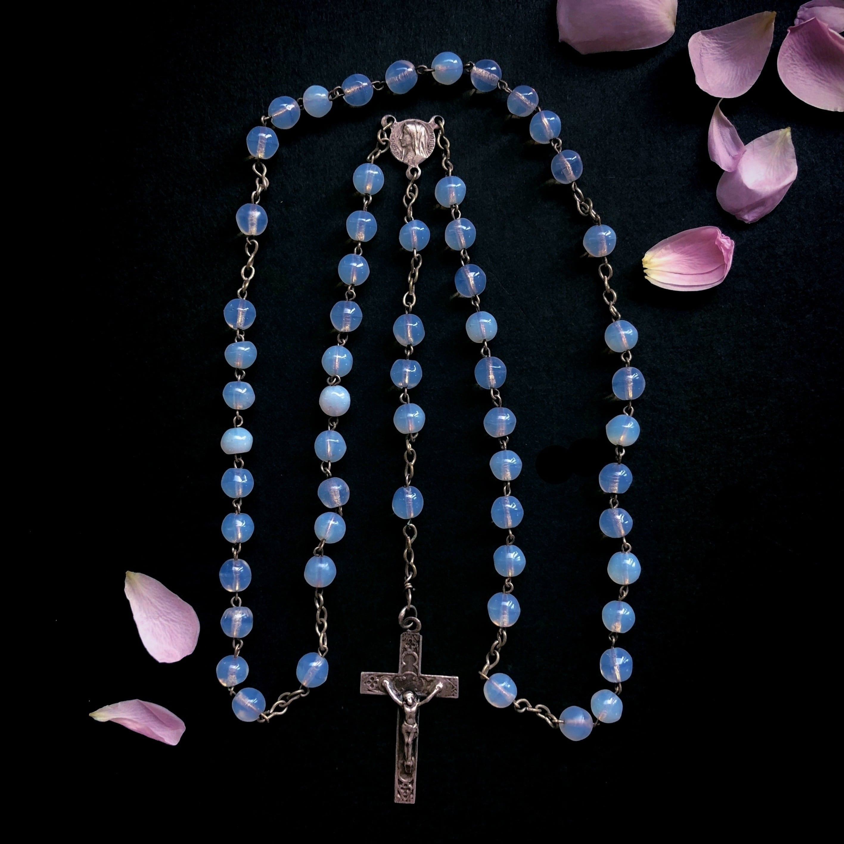 オパールセントガラスのビーズを使ったロザリオです。青白く優しい雰囲気のビーズに光が射すと、薄いアプリコット、もう少し濃いもの、透明感のあるもの、乳白色のものなど、それぞれの玉が少しずつ違う遊色を見せます。