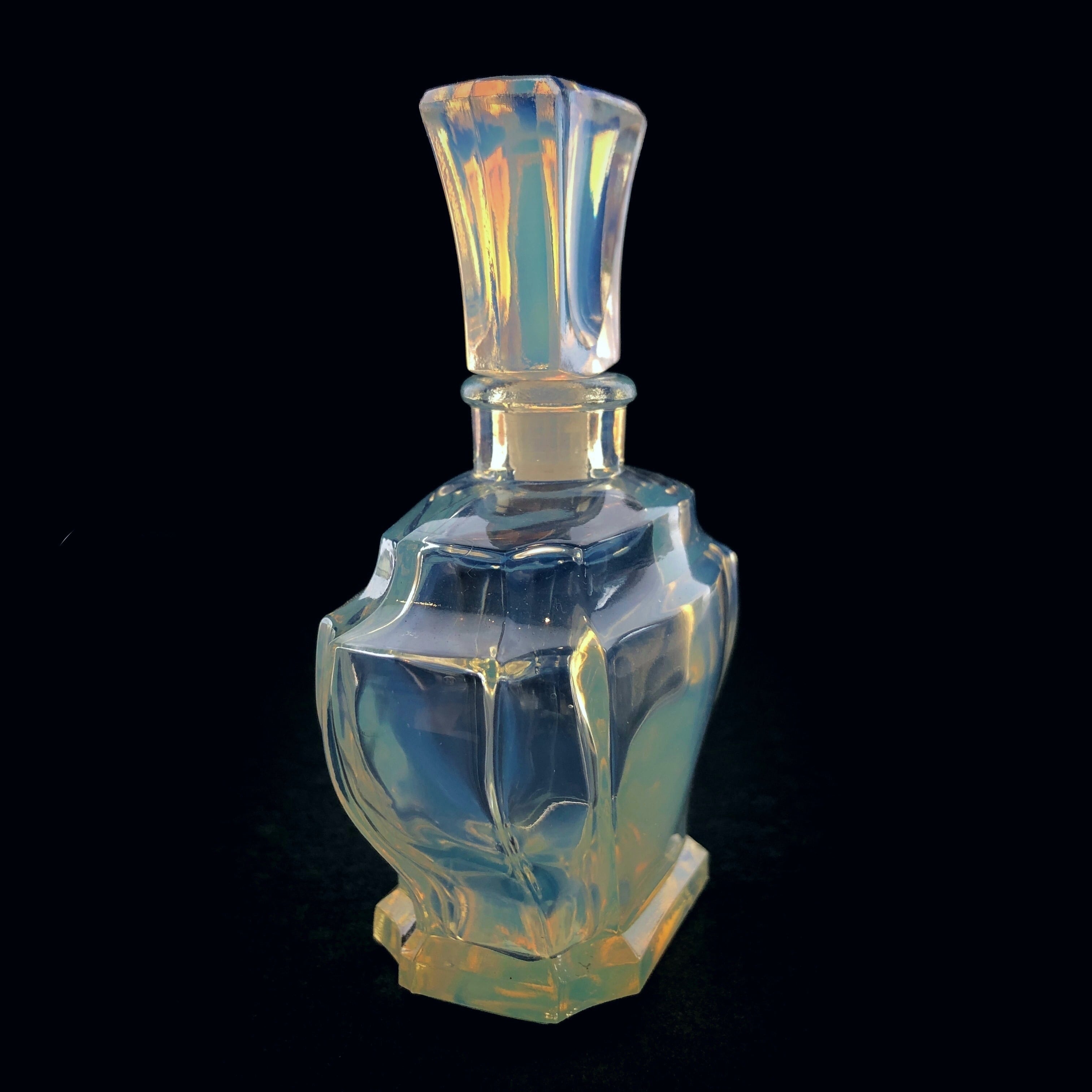 オパールセントガラスの香水瓶です。このお品のガラスには、特に青白く柔らかな透明感と滑らかな質感があります。