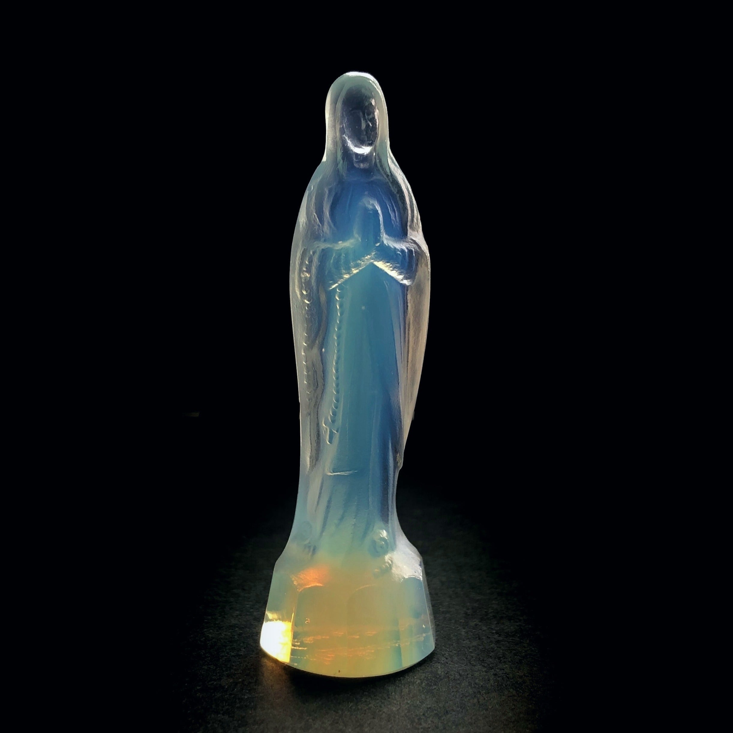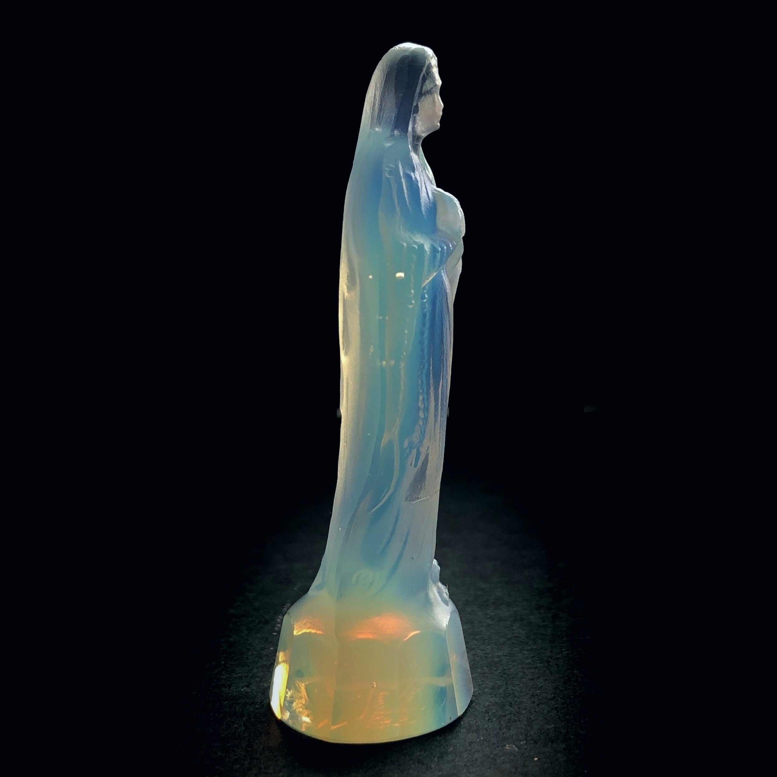 聖母マリアの全身像です。素材のオパールセントガラスは、角度によって青白く光ったりアプリコットの遊色が浮かんだりして夢のような美しさです。優しく神々しい輝きが聖母像にぴったりですね。