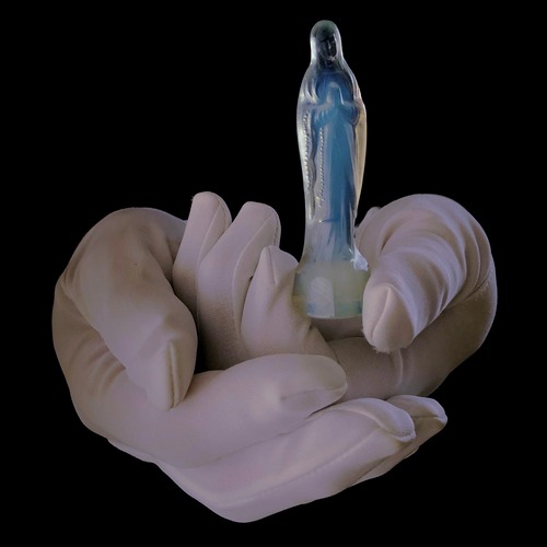 こちらはパリのサビノの工房で製作されたもので、全高が8センチと小振りですが、細かい造りになっています。そのお顔はただ微笑むのではなく、やや上向きの視線でかすかに小首を傾げ、慈愛とも悲哀とも嘆きともとれる表情で、見方によっては童女のようでもあります。