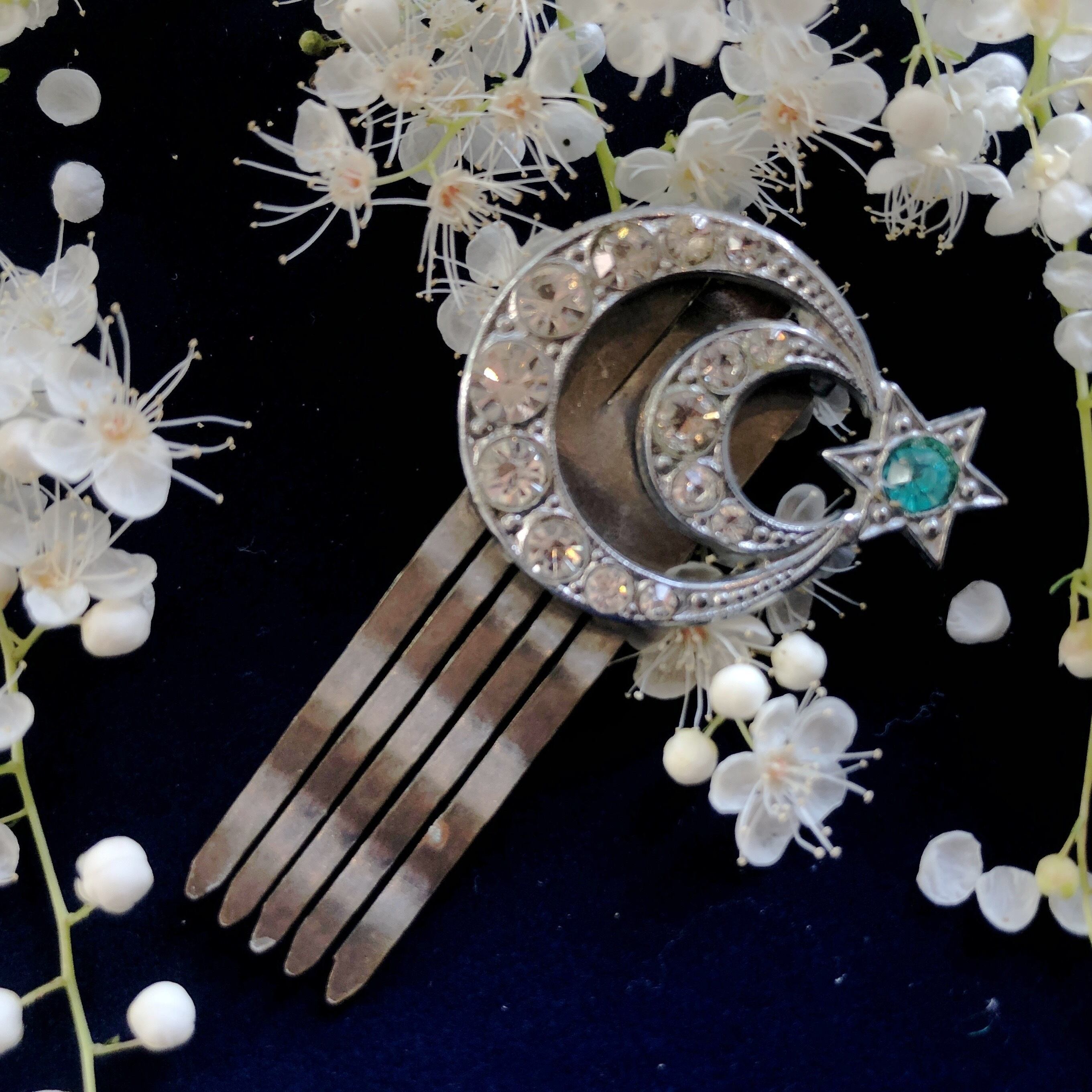 1920年代から1930年代のイギリス製。サイズは、月と星の部分が約2.5×2センチ、髪に留める部分の長さが約2.5センチです。