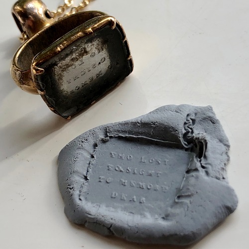 1850年代、ヴィクトリア朝のイギリス製。サイズは、印章面が約1.3×1センチ、持ち手の高さが約2センチです。チェーンは現行品で、長さが約23センチです。