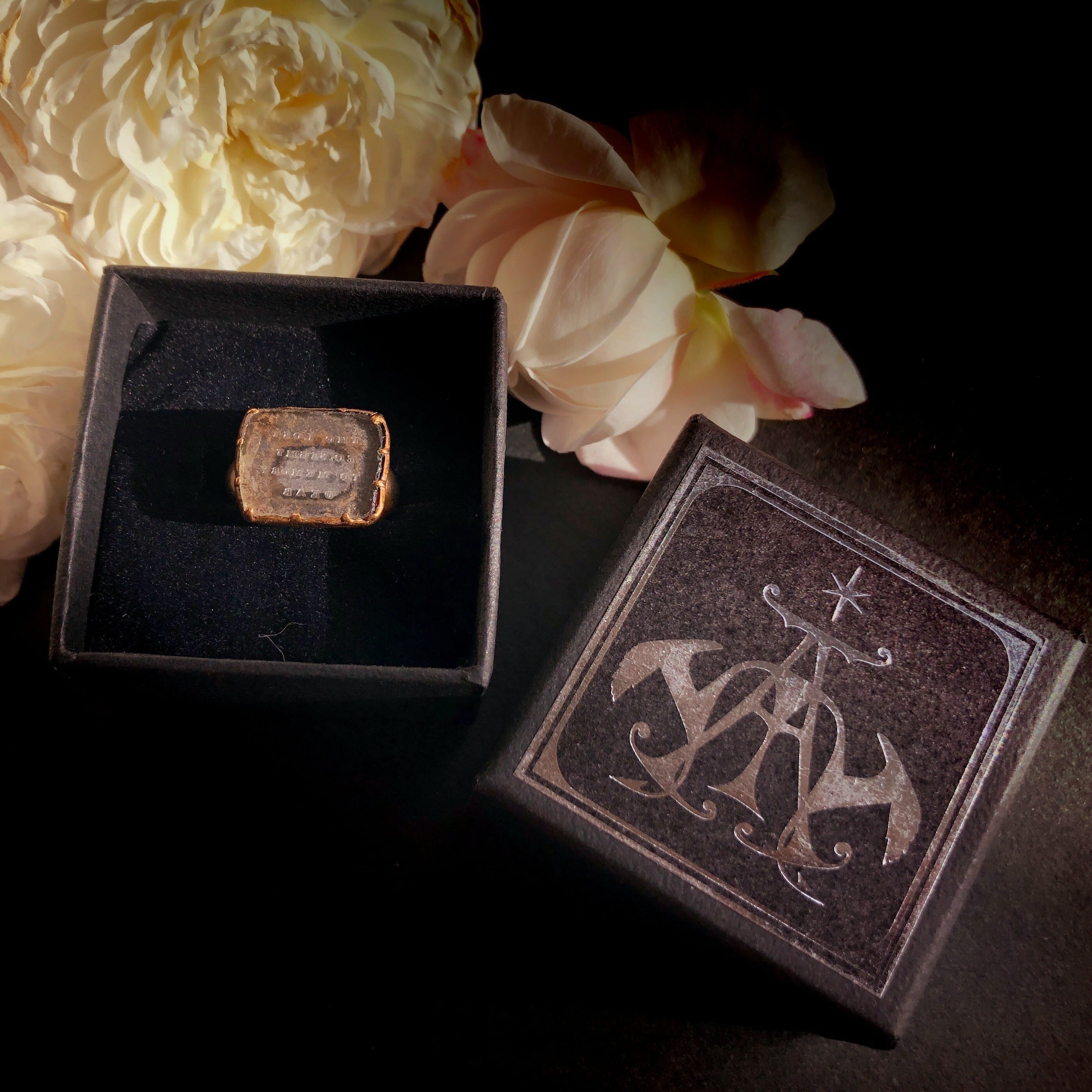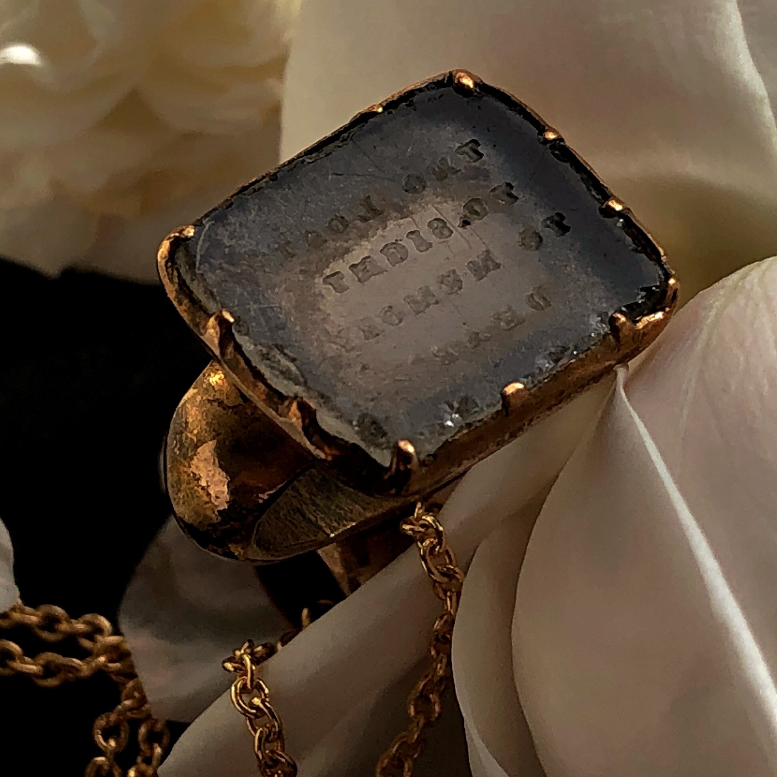 透明な石に細かく文字が刻まれています。それは "THO LOST TO SIGHT TO MEMORY DEAR"「心寄せる想い出を見失ったとしてもなお」という、運命、時の流れの無慈悲さ、人の弱さ、儚さ、そしてそれに立ち向かおうとする秘めた想いを感じさせる文章です。哀しみ、諦め、心の深い所に秘めた勇気、決意、人生の様々なものを思い起こさせる言葉です。