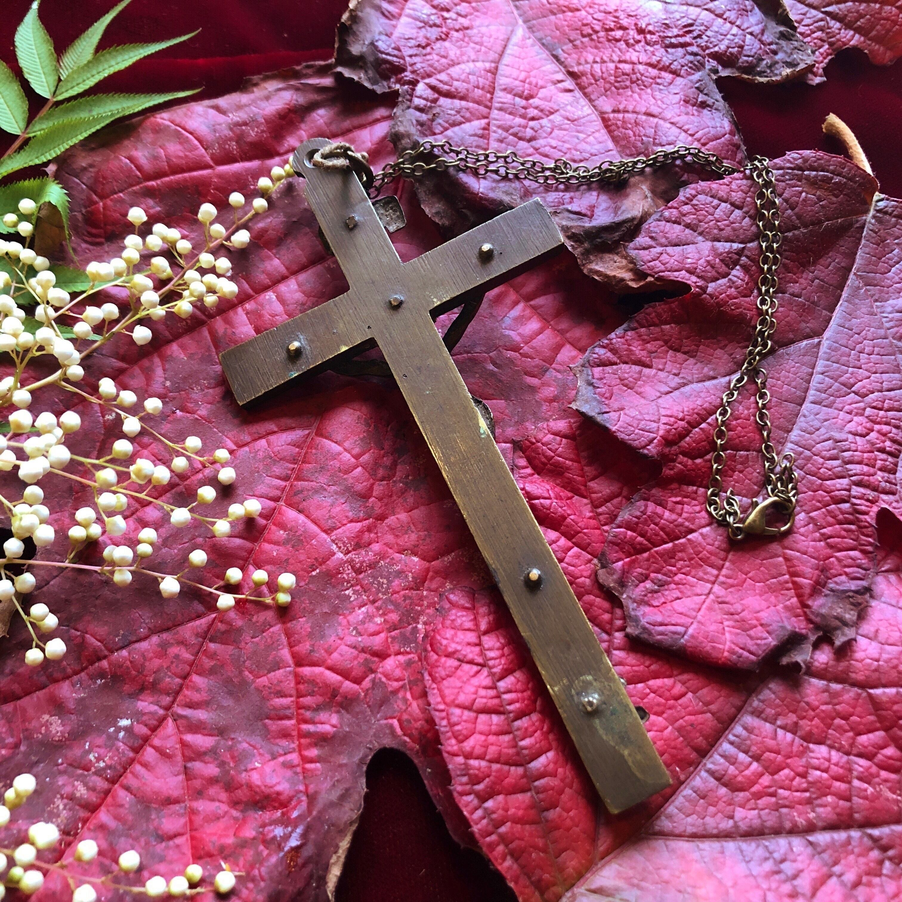 大変古びて迫力のある大振りな十字架です。作法通り木の芯の周りを金属で覆い、イエス・キリストの足元には髑髏があります。第2次世界大戦以前、聖職者用の十字架にはこのように髑髏が置かれたのですが、ナチスドイツが髑髏をデザインしたマークを使ったため、その後は置かれなくなったのです。従って、こちらは少なくとも第2次世界大戦より前の聖職者用のものと考えられます。また、この深い古色を見ると、さらに古く19世紀のものかもしれません。