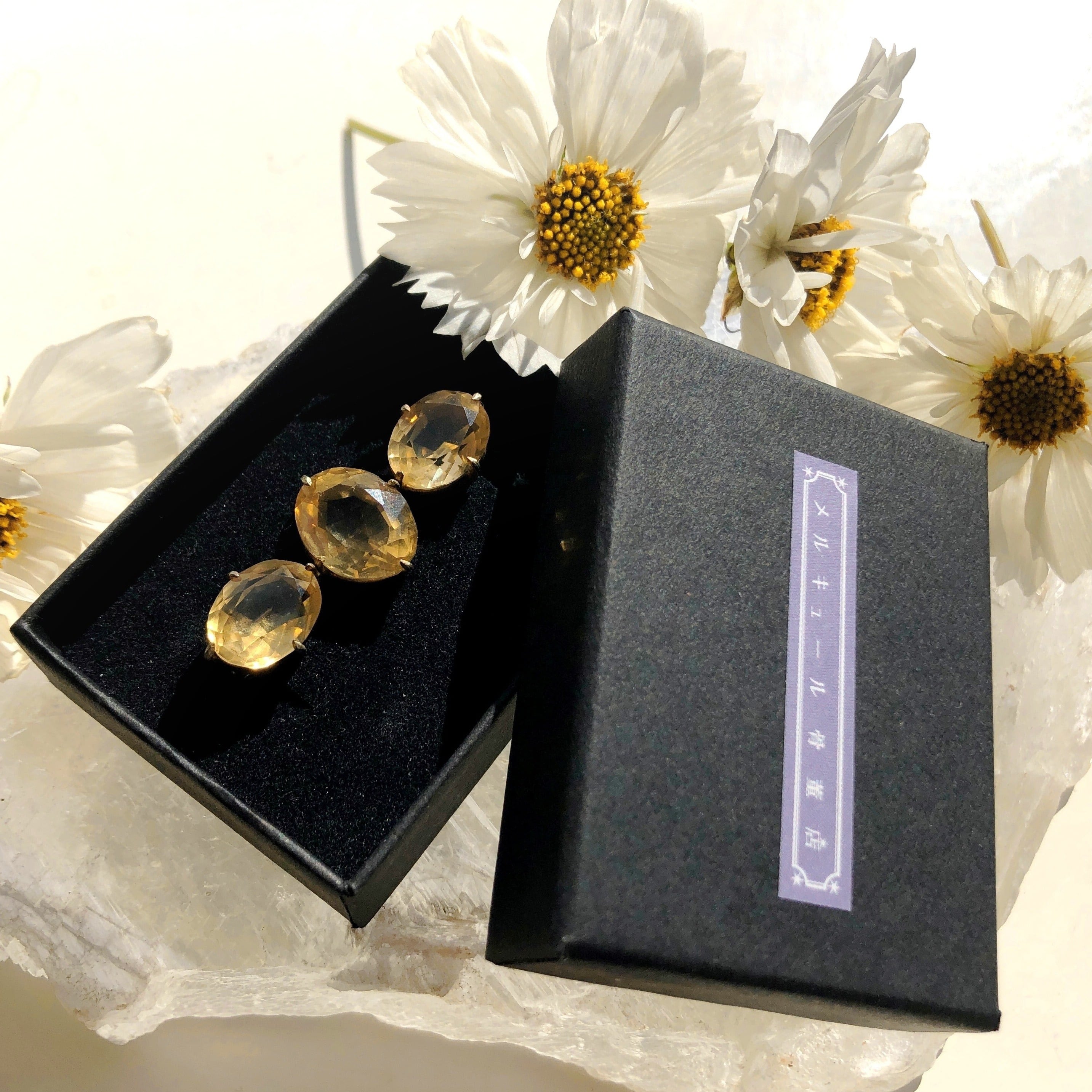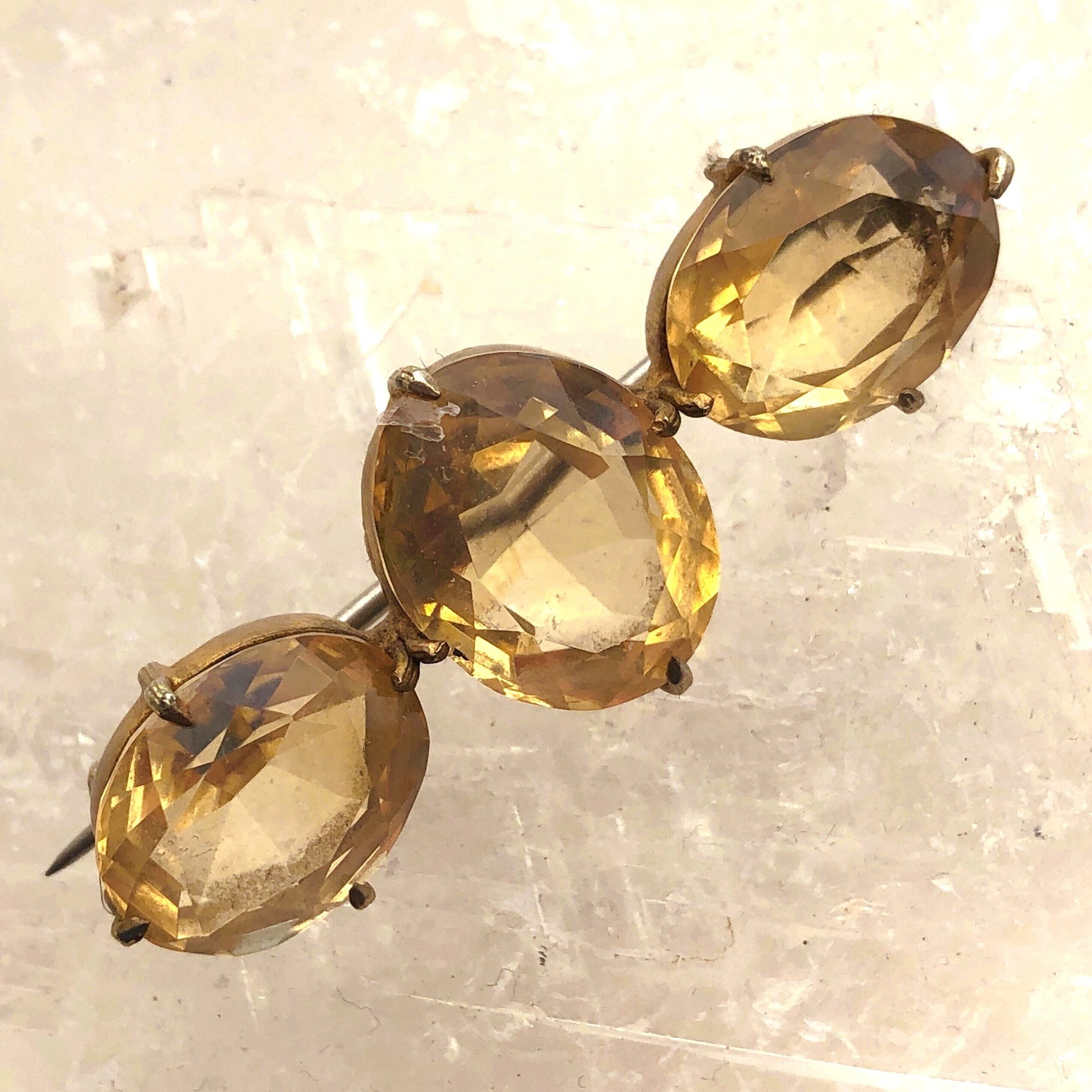 古い黄水晶のブローチです。水晶は綺麗にカットされ、金属の台座は枠のみで裏から光が入るようになっています。とてもシンプルで、台座も石に溶け込んでしまうような控えめなデザインのため、黄水晶のみが存在するかのように見えます。