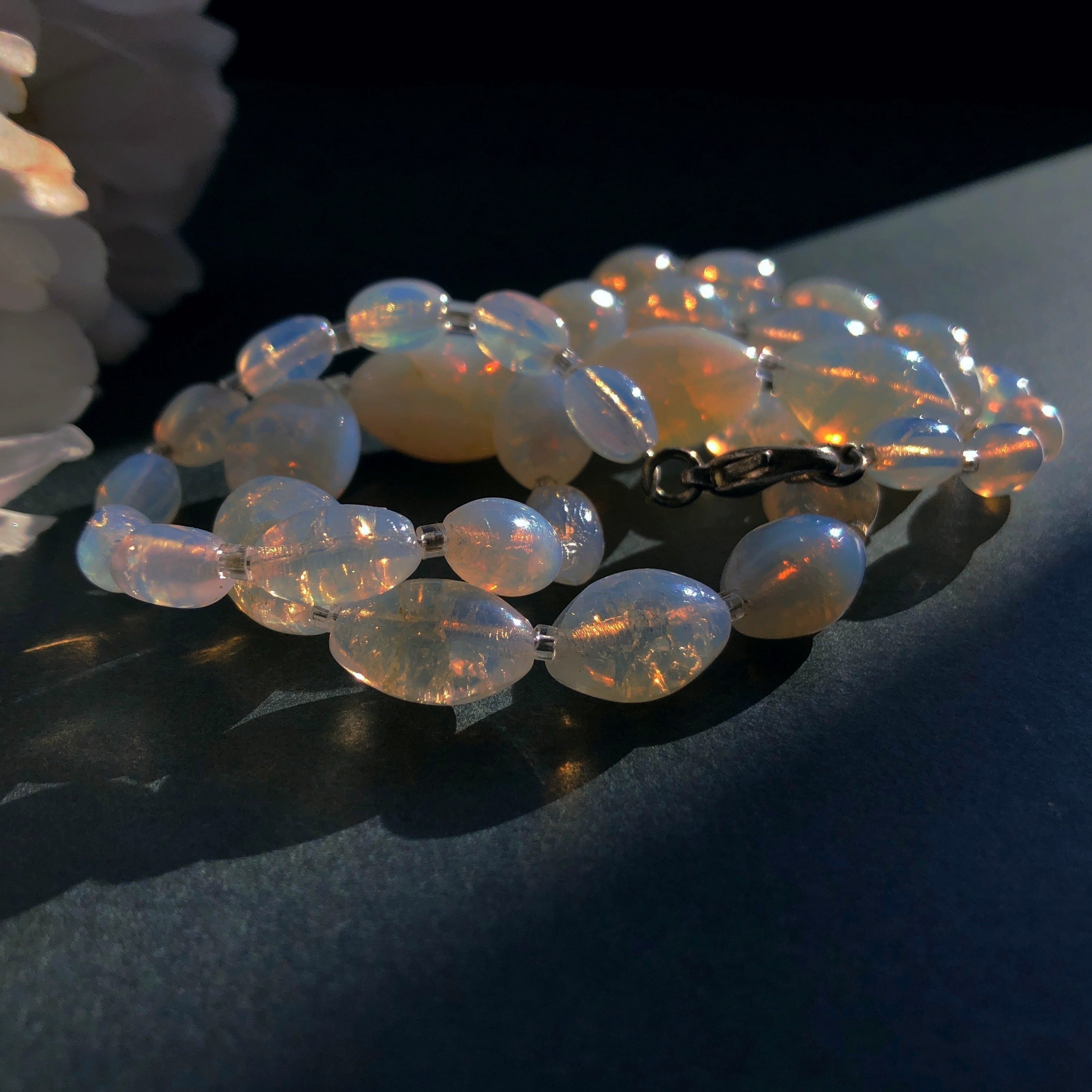 オパールセントガラスのネックレスです。オパールセントガラスは光の加減で青白い光を含んだりアプリコットの遊色が浮かんだりして、夢の中に出てきて時とともに移ろうもののようです。