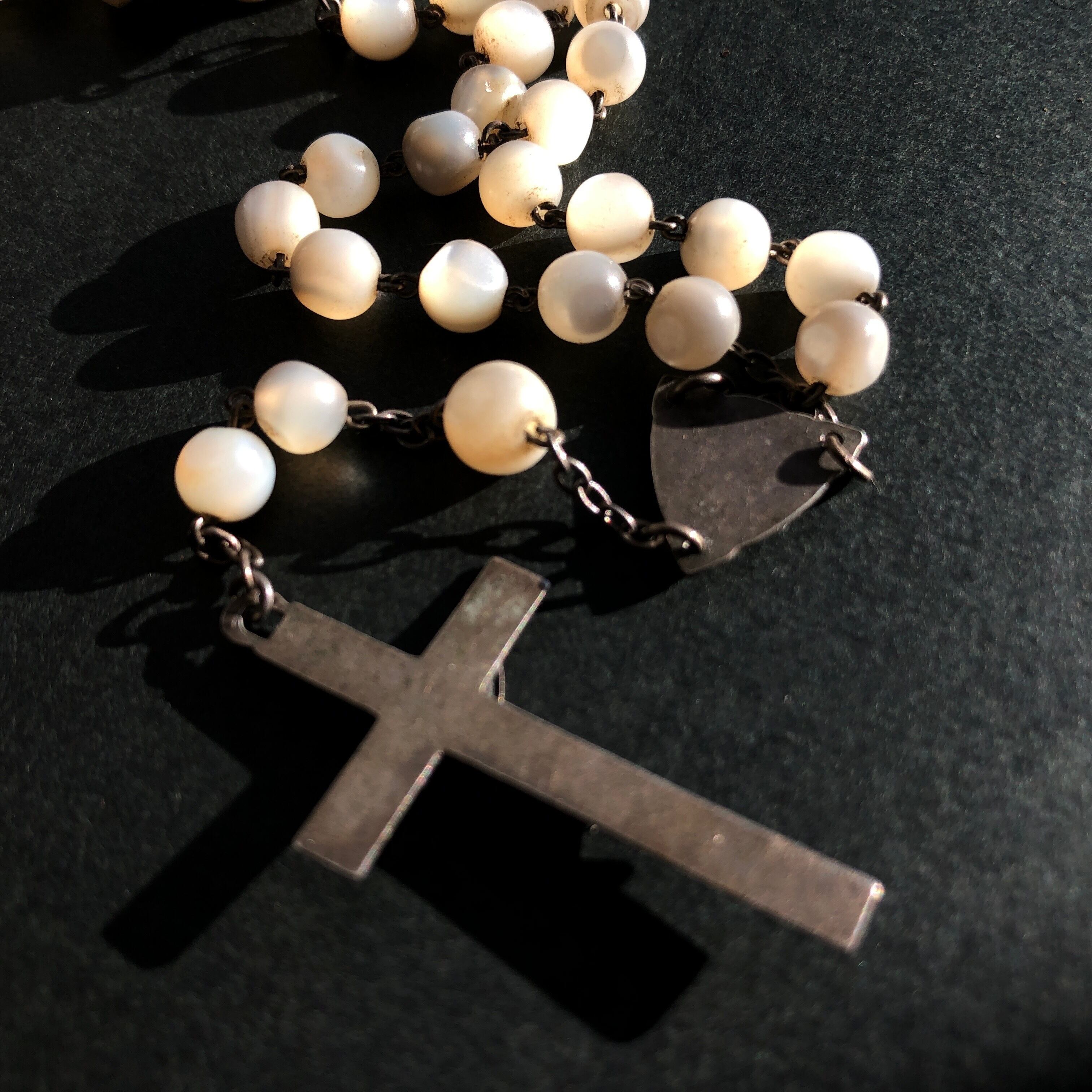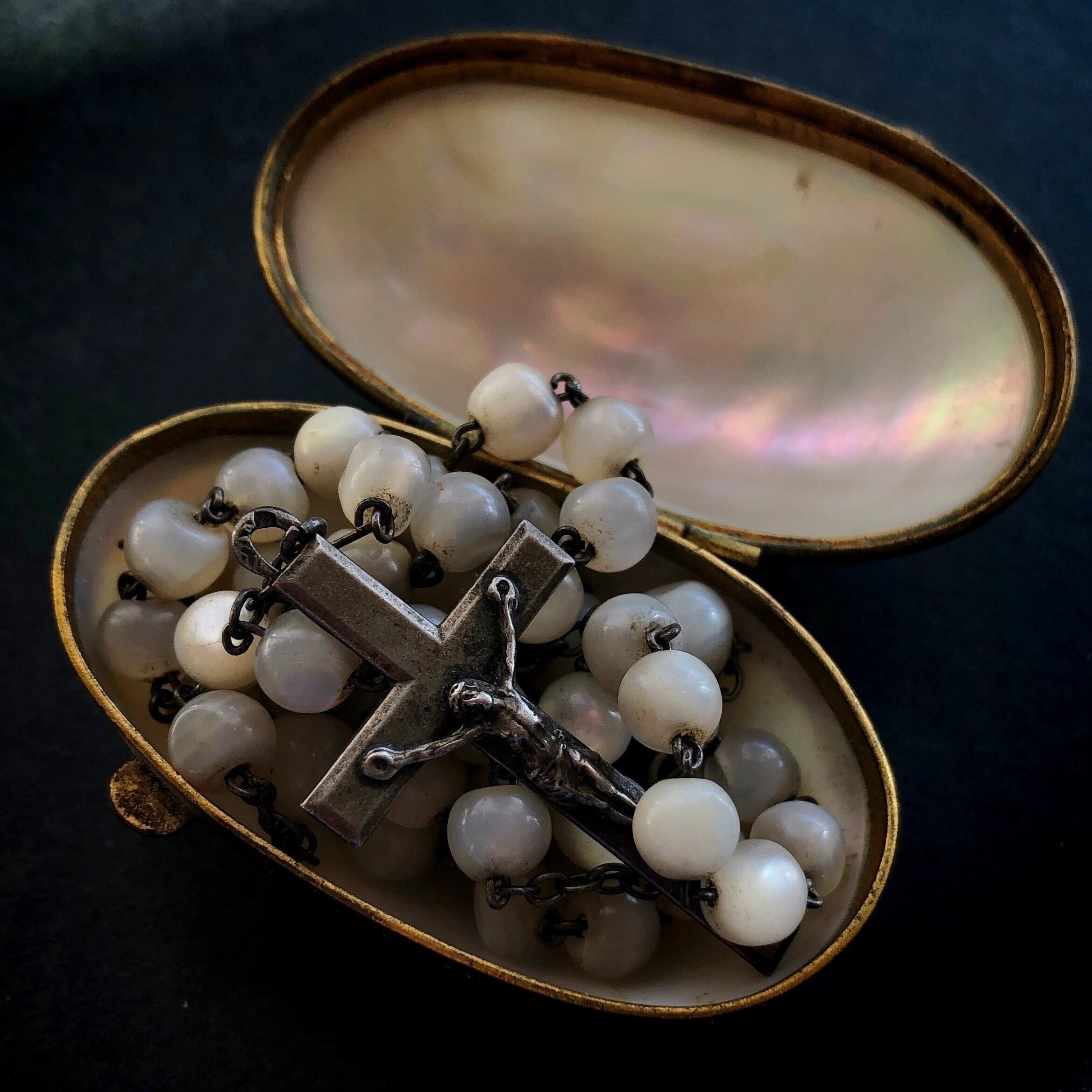 本物の真珠貝を使ったケースと真珠貝を磨いたビーズのロザリオです。真珠貝はキリスト教と親和性があるようで、この真珠貝のケースももともとロザリオケースとして造られたもののようです。そして、ロザリオはこのケースのオリジナルではありませんが、乳白色のビーズがこのケースによく合っています。