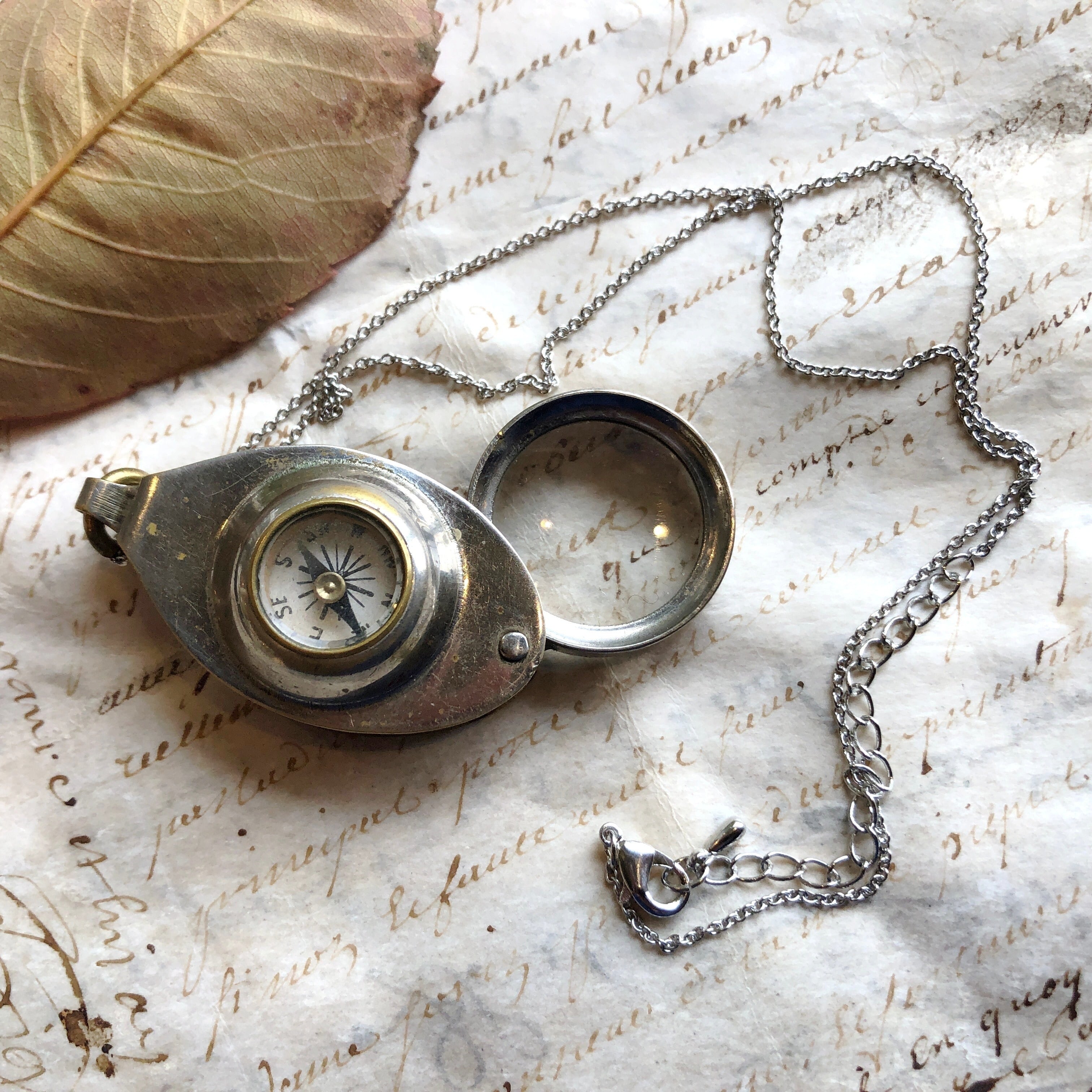方位磁針とルーペのペンダント