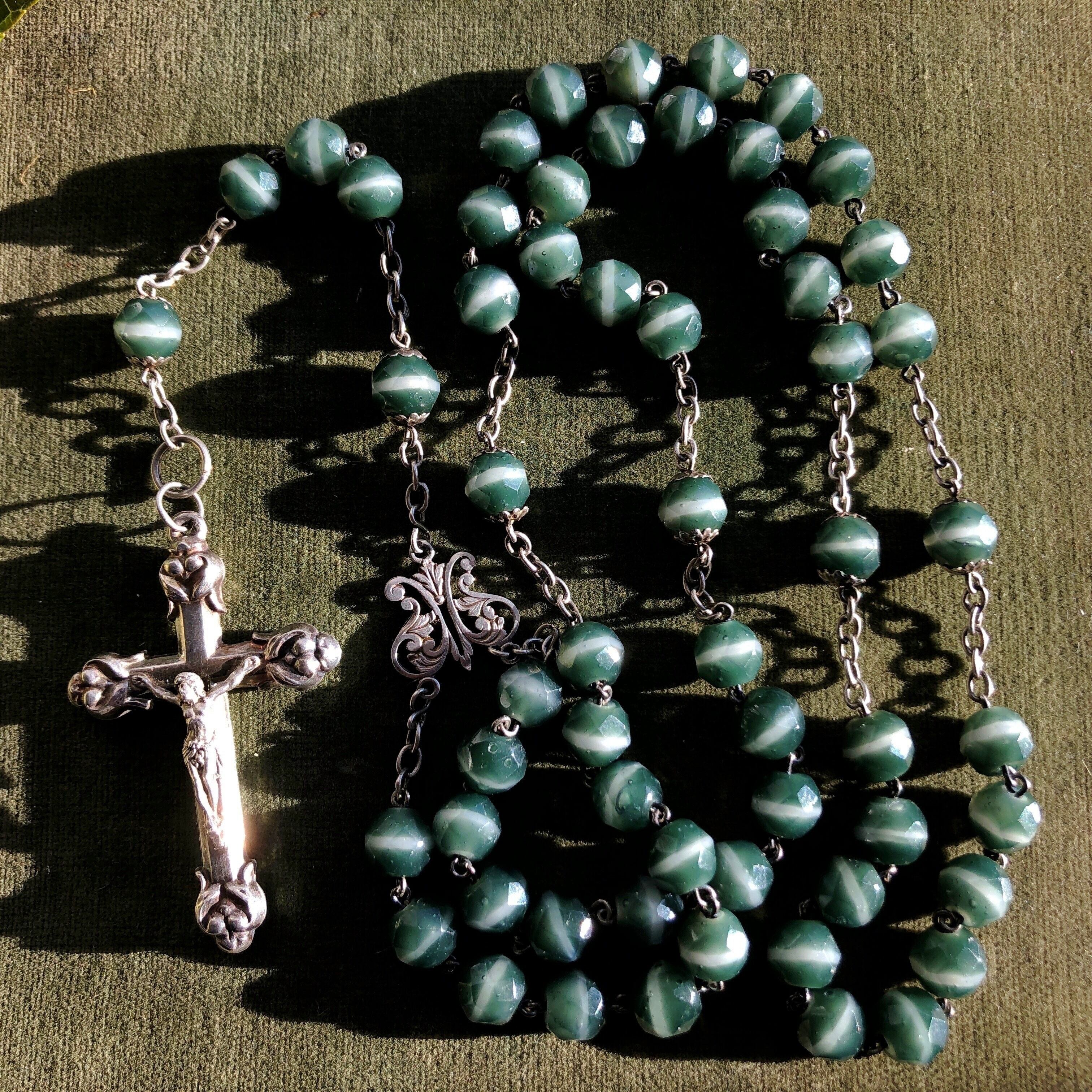 ビーズはとても綺麗な深緑で、中央に乳白の筋が入っています。色味がとても印象的で美しいロザリオで、ビーズは硬質な感じである程度の重さもありガラスと思われますが、樹脂である可能性もあります。