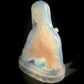 オパールセントガラスの聖テレーズ半身像です。オパールセントガラスは、ガラスとは思えない柔らかな質感で青白く佇む雰囲気ですが、光の加減で様々にアプリコットの遊色を浮かび上がらせます。こちらのお品は像の流れるようなおうとつやローブの襞に合わせて濃く、薄く、ぼんやりと幻想的な遊色を浮かべます。また背後から光をあてるとお顔が特に濃く色を帯びて浮かび上がります。