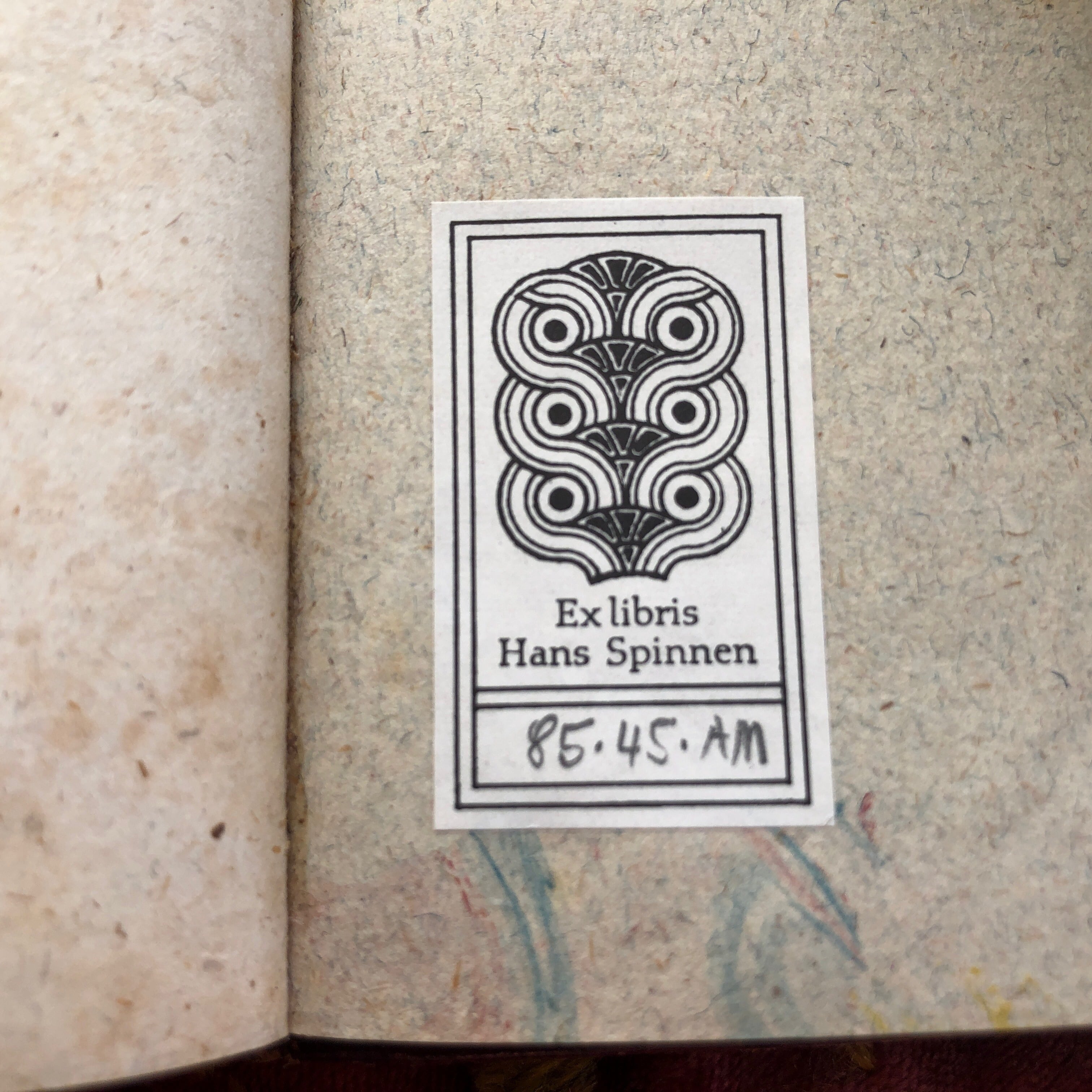 キリスト教におけるプロヴィデンスの目の意匠は「神の全能の目」を意味します。未だに艶を残す美しい革の装丁にその目が、三位一体を表す三角形や光背とともに浮き彫りになっています。こちらの書籍はドイツ、バイエルン州のデッゲンドルフで1830年に出版されたもので、フラクトゥールで書かれたドイツ語でとても読みにくいのですが、「聖なるイエス様」というような題名で、扉に「救世主」と記された図版があります。また見開きに手書きの文字も見られ、ひょっとしたらこの方が製本工房にこの装丁を発注した本人かもしれません。