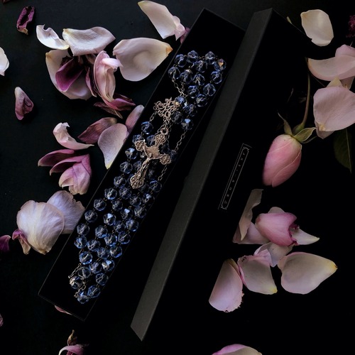 綺麗にカットされた爽やかなアクアブルーのガラスのビーズをあしらったロザリオです。青は元々マリア様の色ですが、こちらのお品の青は特に清々しい輝きを宿しています。クロスも途中につけられた「アヴェ・マリア」を表すモノグラムも細かい造りで存在感がありますが、このビーズの軽やかで美しい色味のせいで、全体に若々しい活力に満ちた清らかさを感じてしまいます。