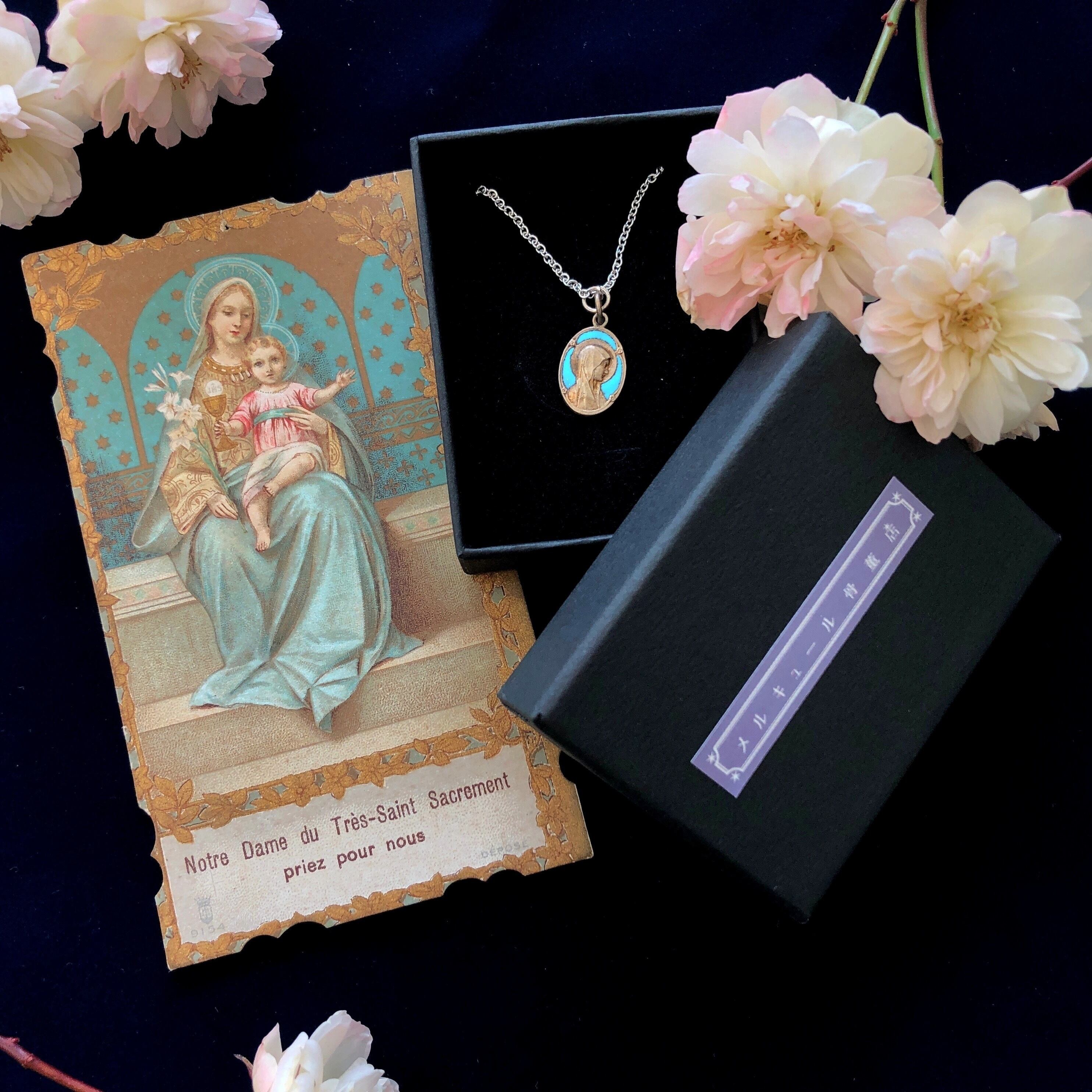 メダイは19世紀から20世紀初め頃までのフランス製。サイズは約1×1.3センチ、チェーンは現行品で長さが約42センチです。