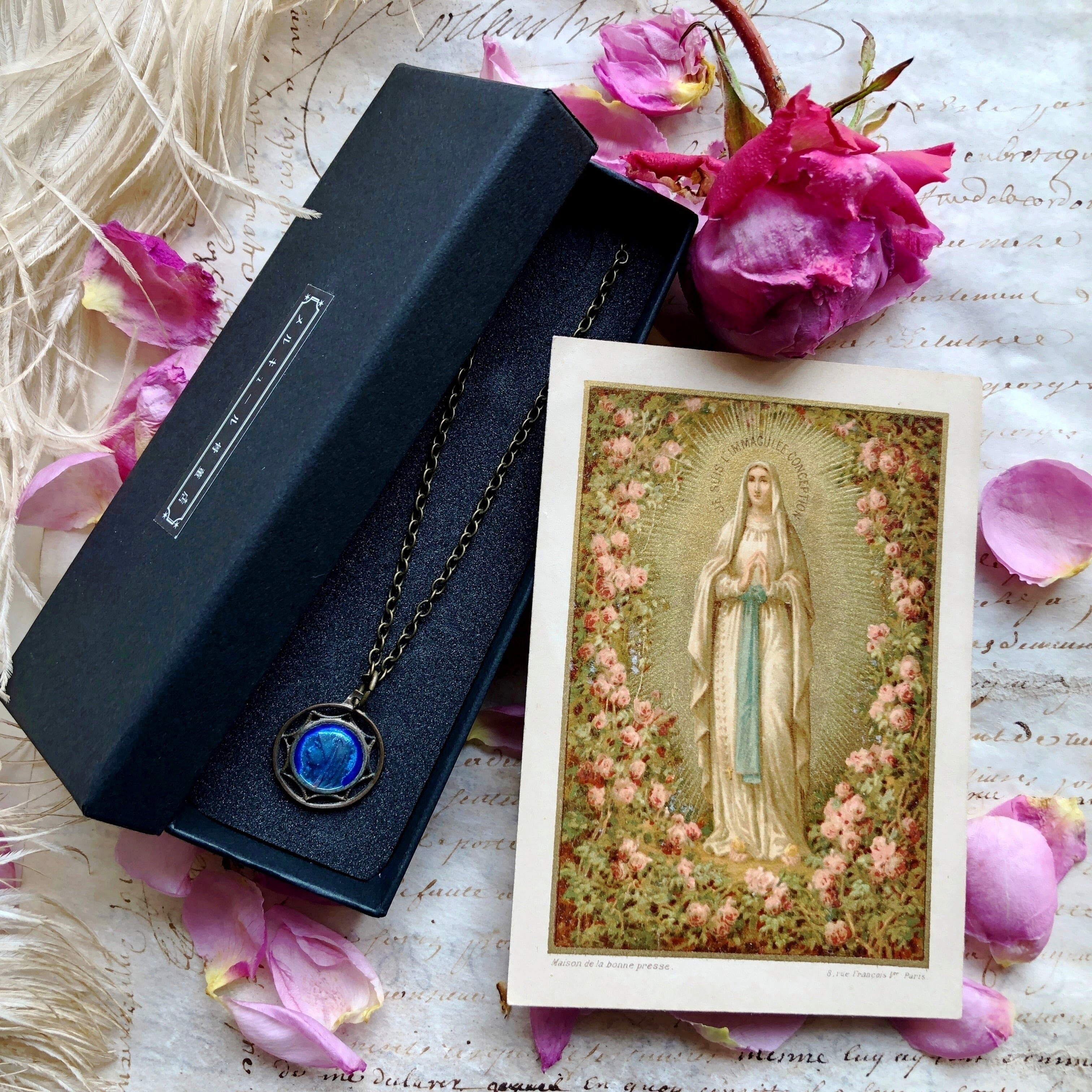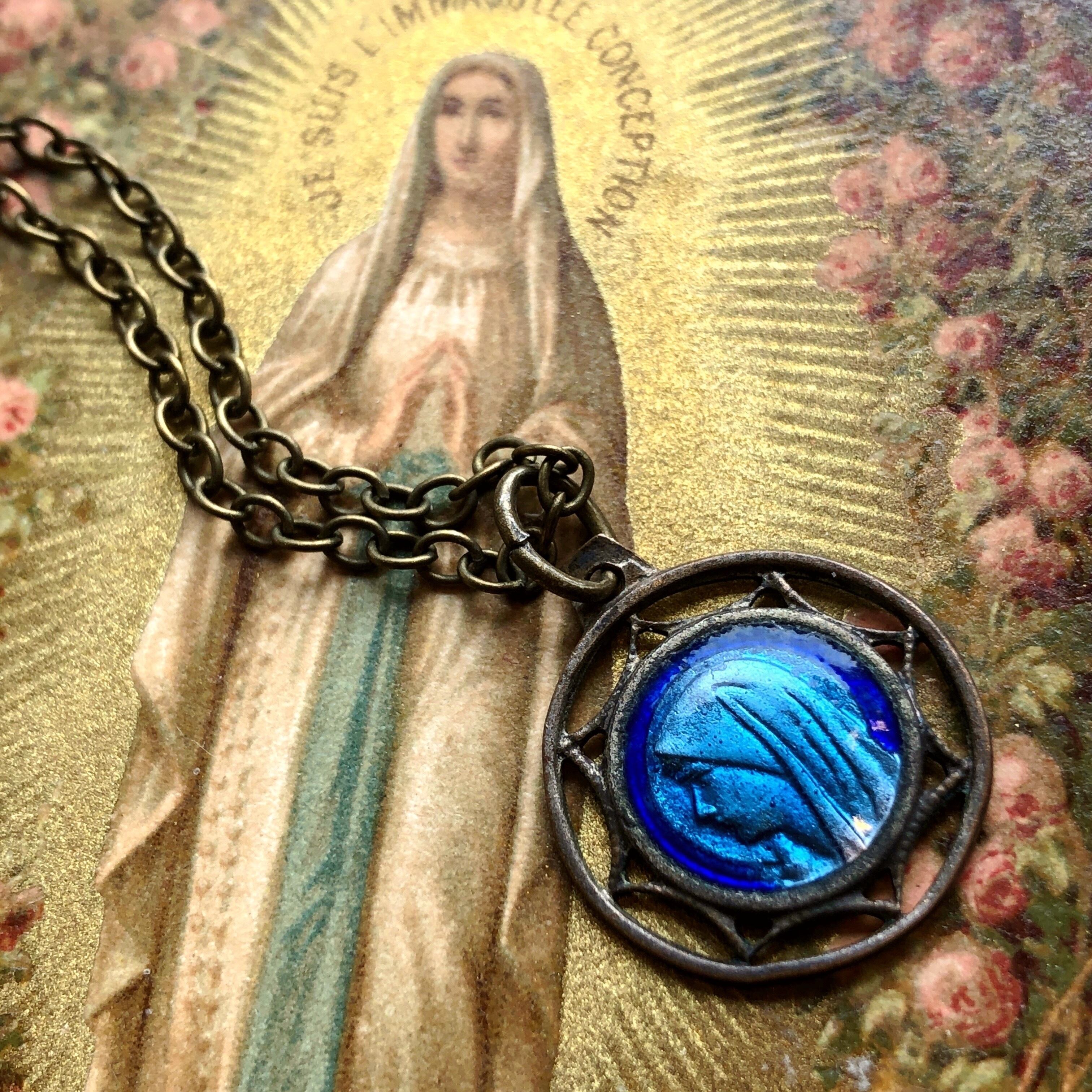 それに合わせるメダイはマリア様の色、青の彩色を施されたものです。片面がマリア様の横顔、反対の面にはルルドの泉で少女ベルナデッタが貴婦人と出会う場面が描かれています。青の中にぼんやりと浮かぶその光景は夢の中の一場面のようです。その周囲の慎ましくも細やかな金属の枠は、長い時を経て落ち着いたよい古色を帯びています。