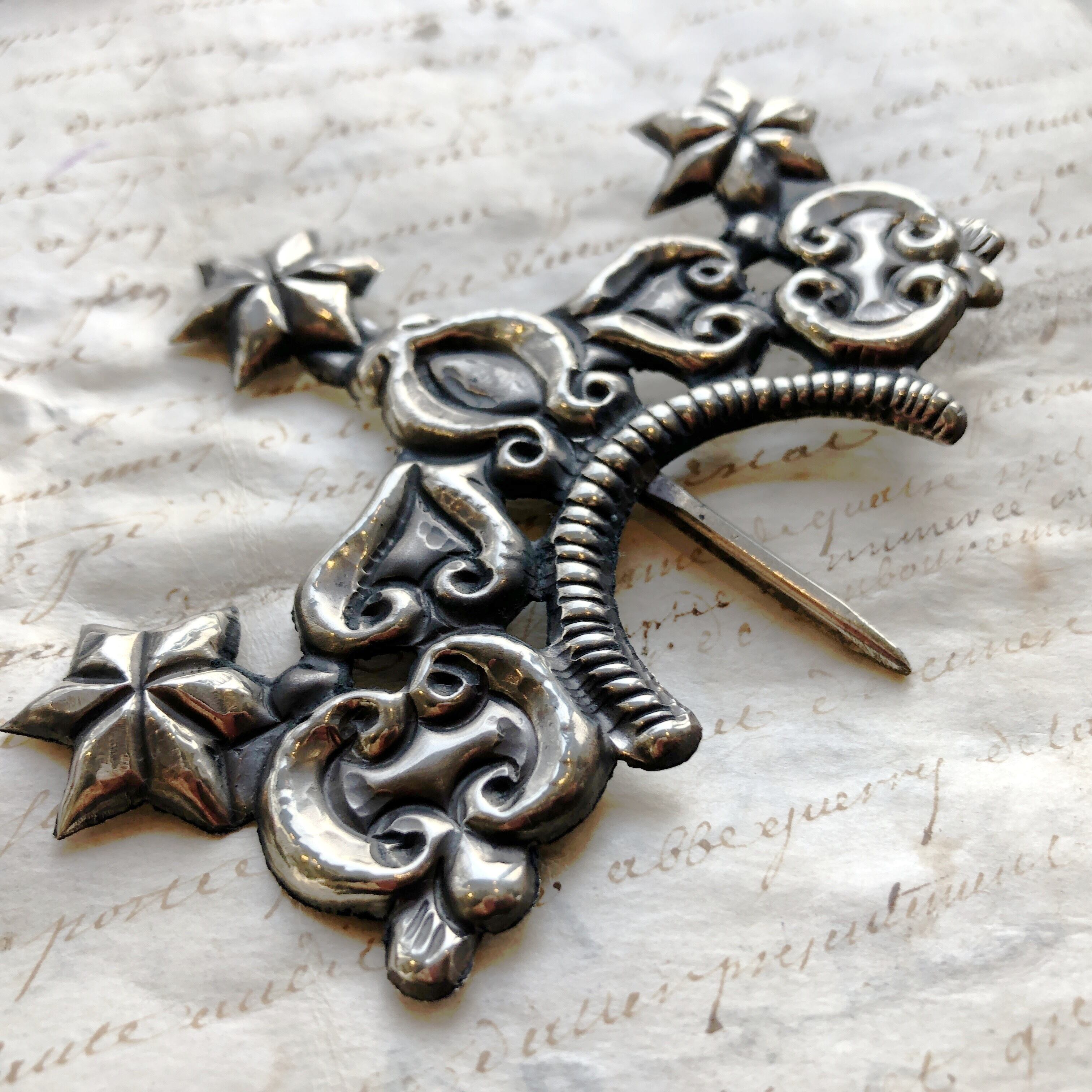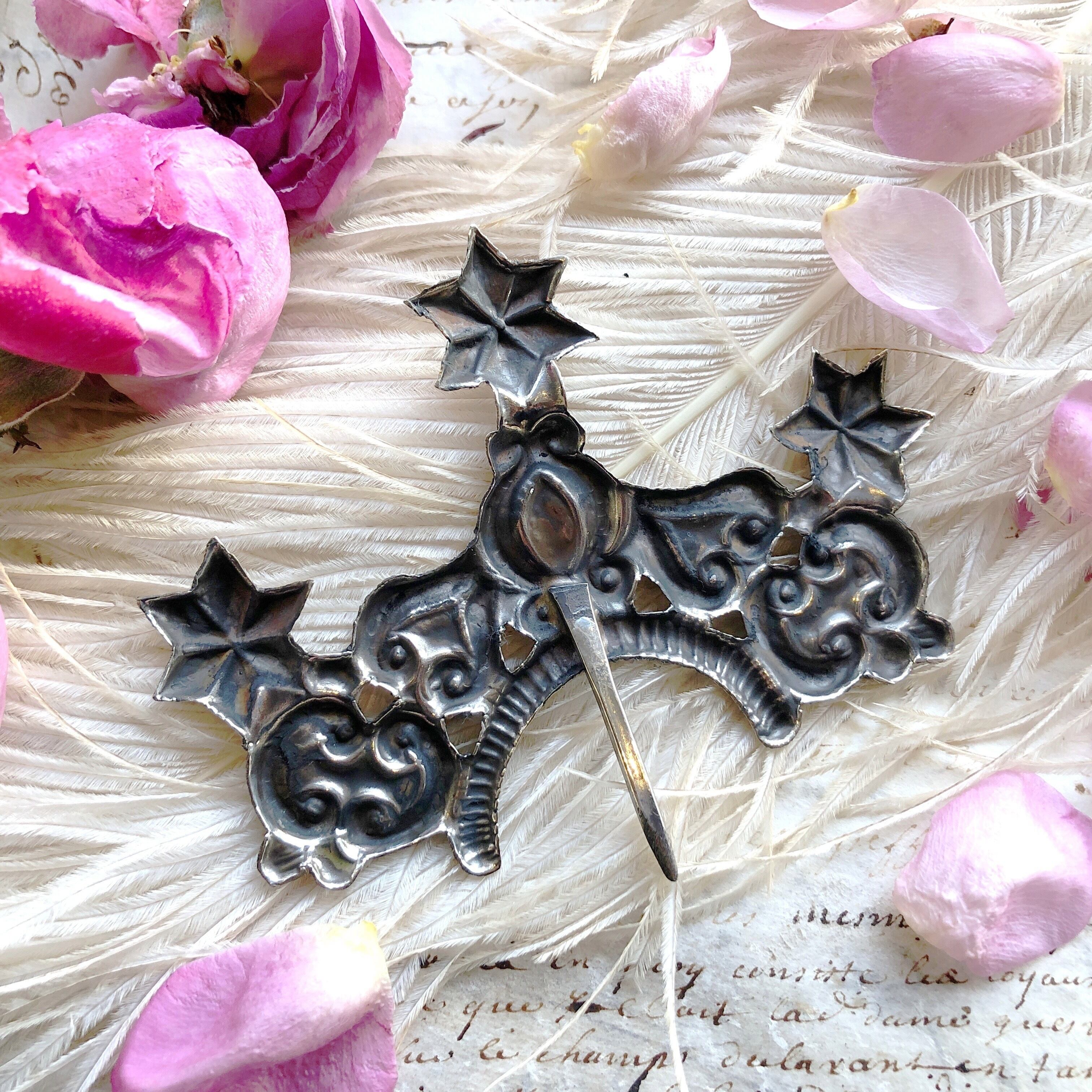 アクセサリー用に作られたものではない為、裏側のエッジに鋭い部分がございます。髪飾りとしてお使いの場合は、お怪我をしないようお気を付け下さいませ。ホールマークなどは見つかりませんが、おそらく100年程前の銀製か銀メッキだと思われます。