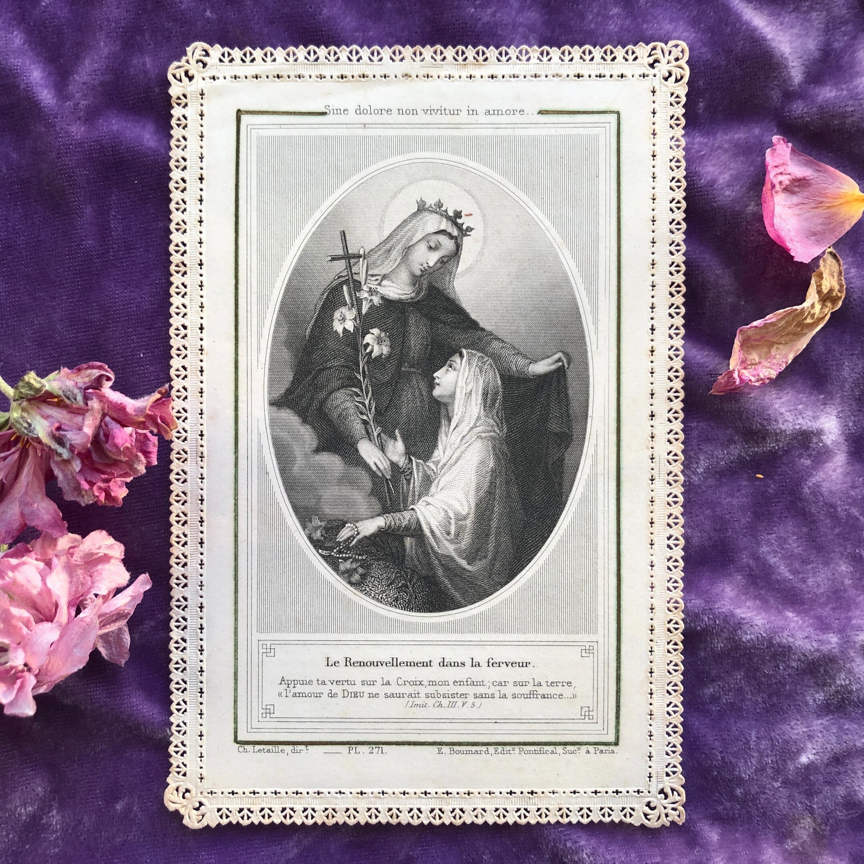 メダイ、カードともに19世紀から20世紀初め頃までのフランス製。サイズは、メダイが約1.5×2センチ、チェーンは現行品で長さが約43センチ、カードは約8×12.2センチです。