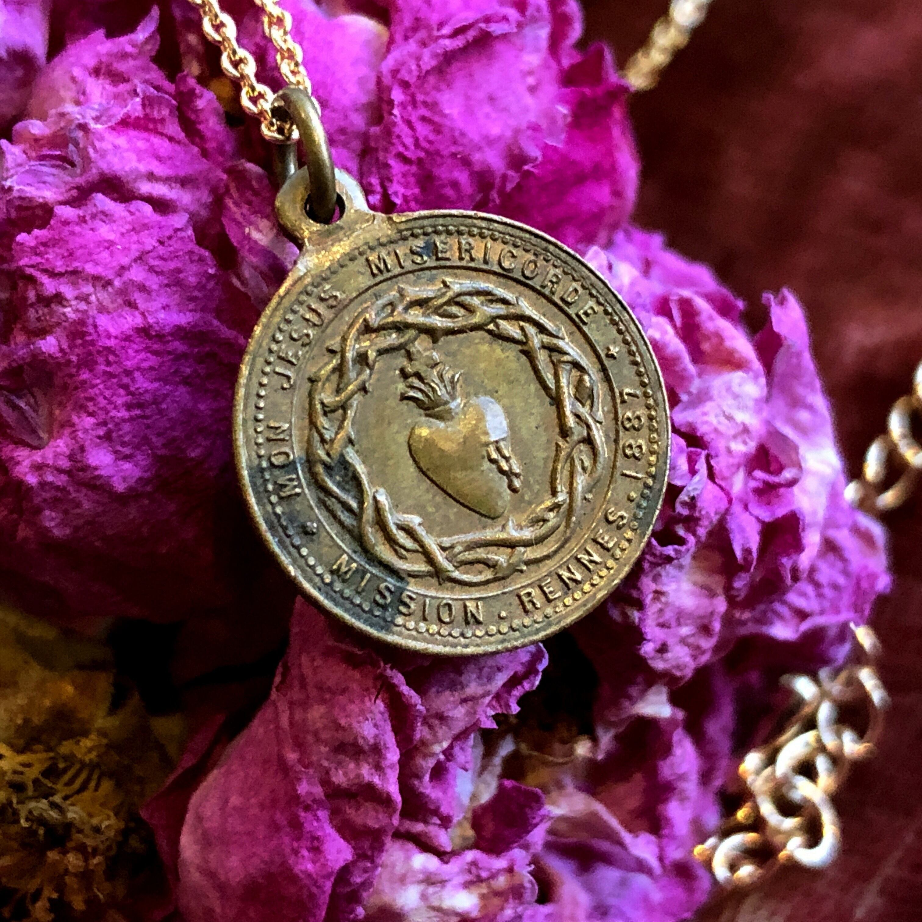 メダイは小さいですが手が込んでいます。聖母子像が片面に、もう一方にはイエス・キリストの受難と聖心を表す荊に囲まれ血を流し燃える心臓が浮き彫りになっています。