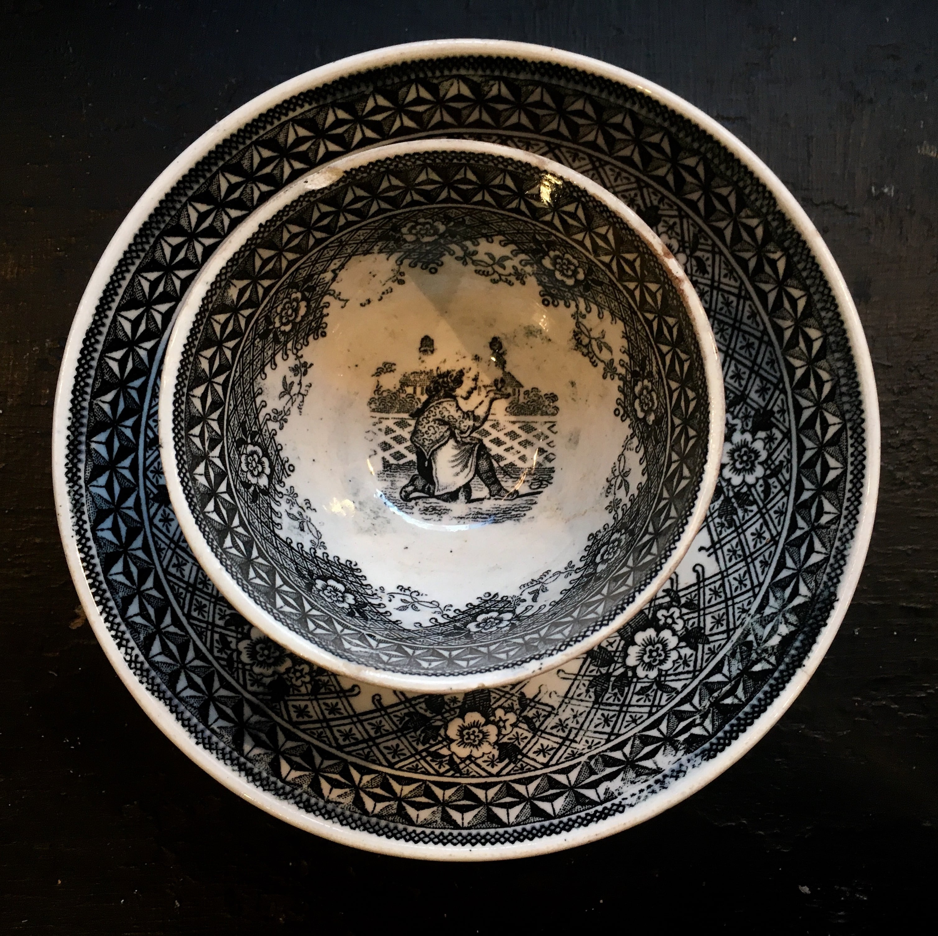 17世紀に中国から西洋に紅茶が伝わり、やがてヨーロッパでも茶器が作られるようになります。初期のティーカップは中国の茶器を模した、小型で取っ手の無いカップで、受け皿に紅茶を注いで飲むスタイルでした。これはその頃のもので、子供達が独楽で遊ぶ様子が描かれています。1700年代、フランス製です。カップの縁に複数の欠け、汚れがあり、サイズは、カップが直径約7.5センチ、高さ約4センチで、受け皿が直径約12.5センチです。