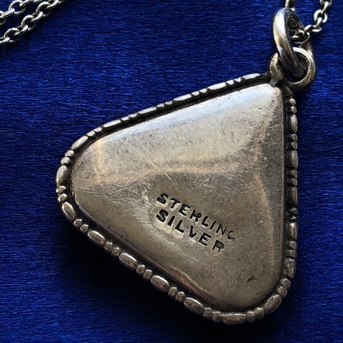 1920年代のイギリス製。ケースはスターリングシルバーで、サイズは三角の底辺が約2.3センチ、高さが約2センチです。チェーンもオリジナルで、長さが約43センチです。