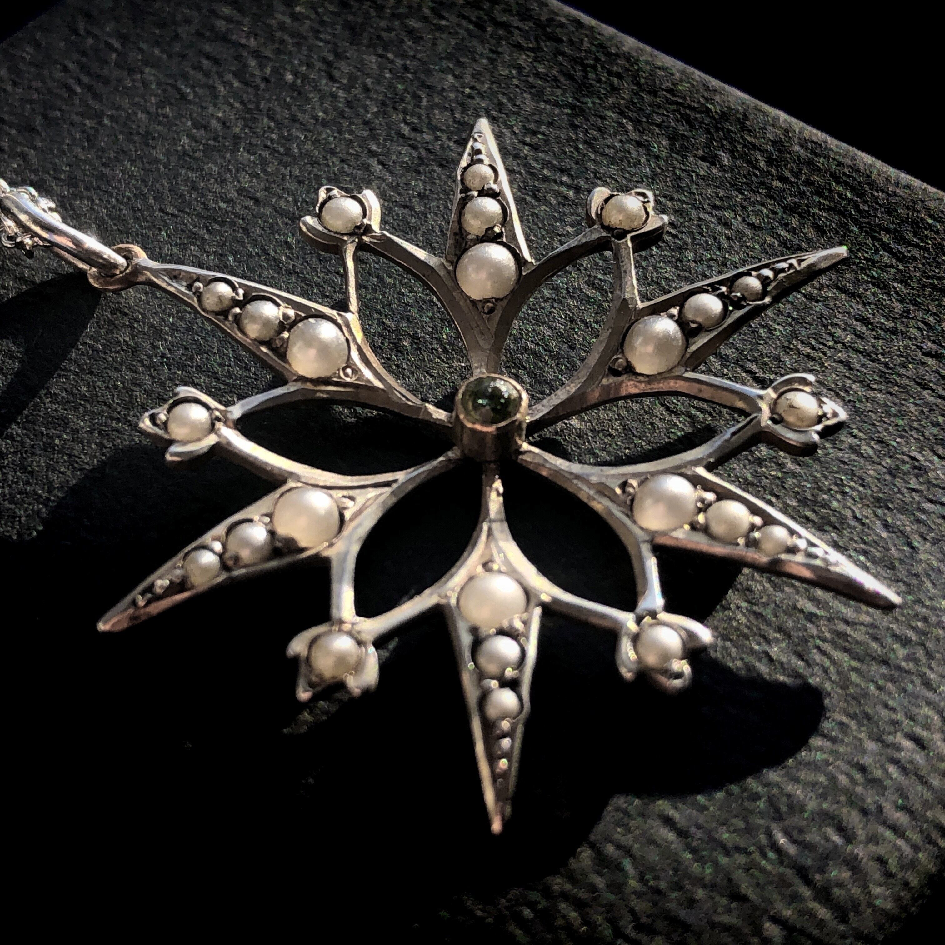 花開くように四方に光を拡げていく星のペンダントです。曲線を巧みに組み合わせた生き生きとした意匠が見事で、シードパールをそれぞれ大きさを変えてグラデーションで配置しています。中央の石は素材が不明ですが、天然石のようにも思われます。