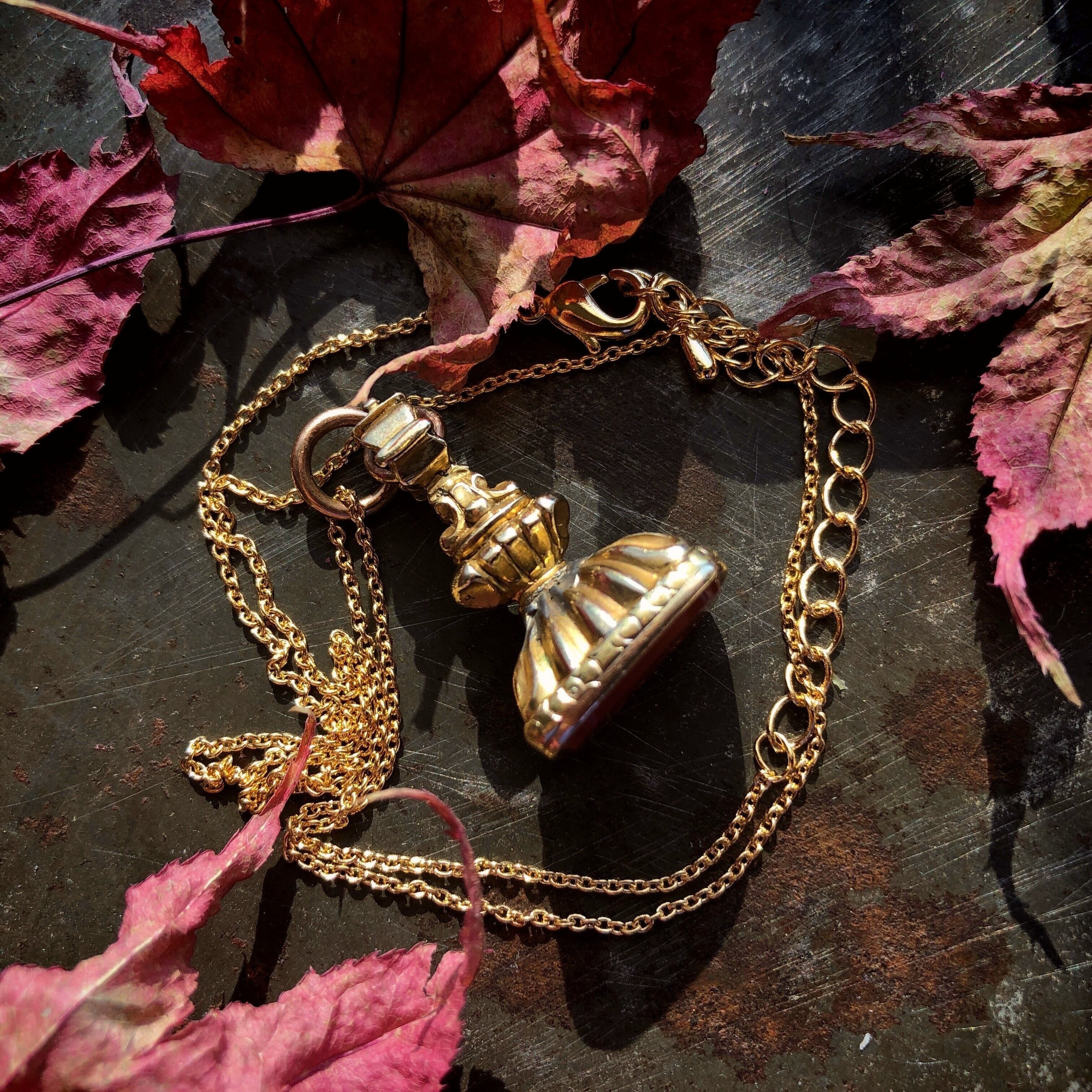 19世紀、ヴィクトリア朝のイギリス製。サイズは、印章面が約1.5×1.3センチ、持ち手の高さが約2.5センチ、チェーンは現行品で長さが約43センチです。
