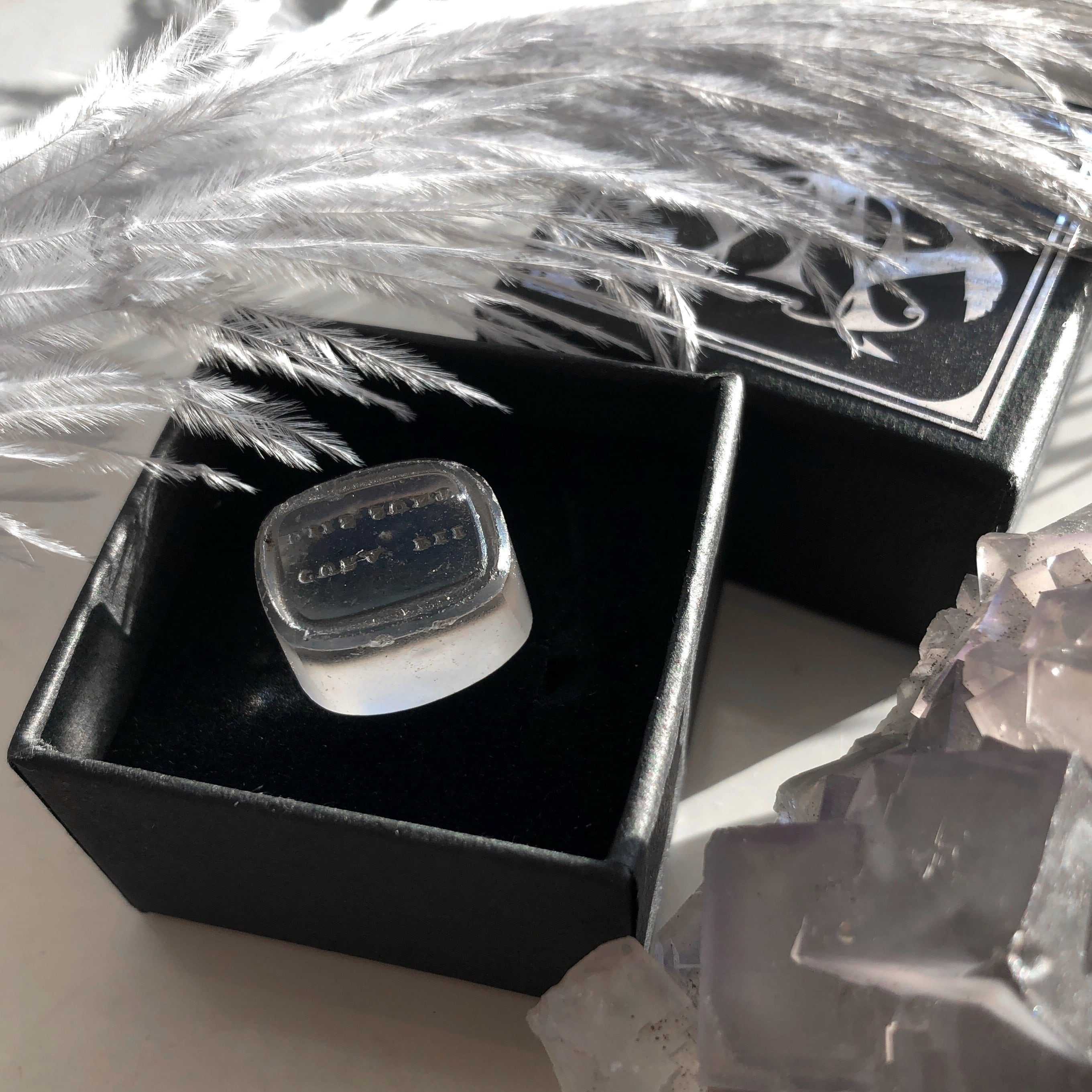 シンプルな光の粒のようなガラスの印章に、ラテン語で"CURA PII DIIS SUNT"「神々を大切にせよ」と彫られています。