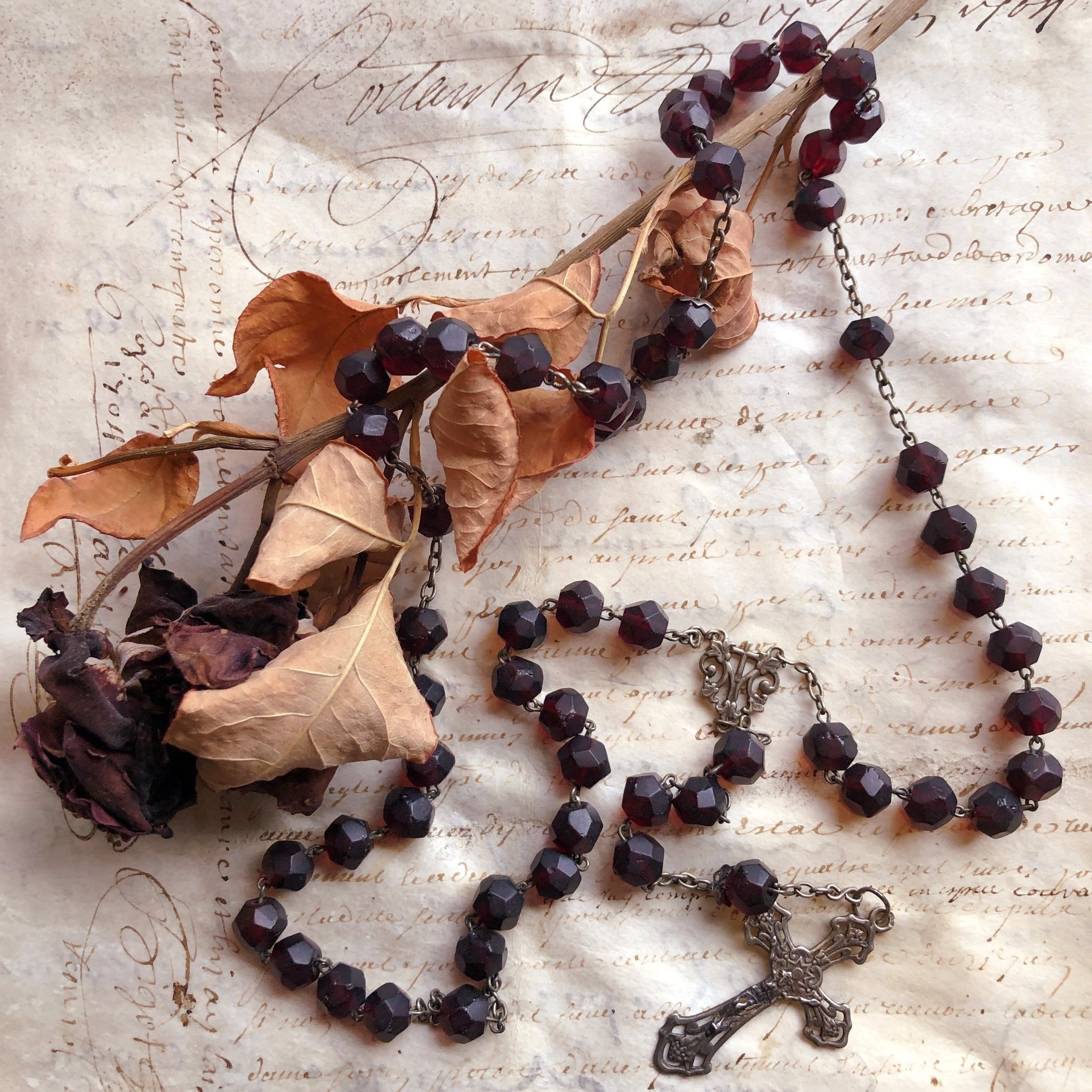 綺麗な柘榴色、その表面はつや消しで落ち着いた風合いのビーズをあしらったロザリオです。ビーズは少し大粒で、手にした感じは、見た印象よりもどっしりとしています。クロスも、途中に配置したアヴェ・マリアを表すプレートも繊細で丁寧な造りで、金属は古色を帯びて鈍い光を残すよい質感です。