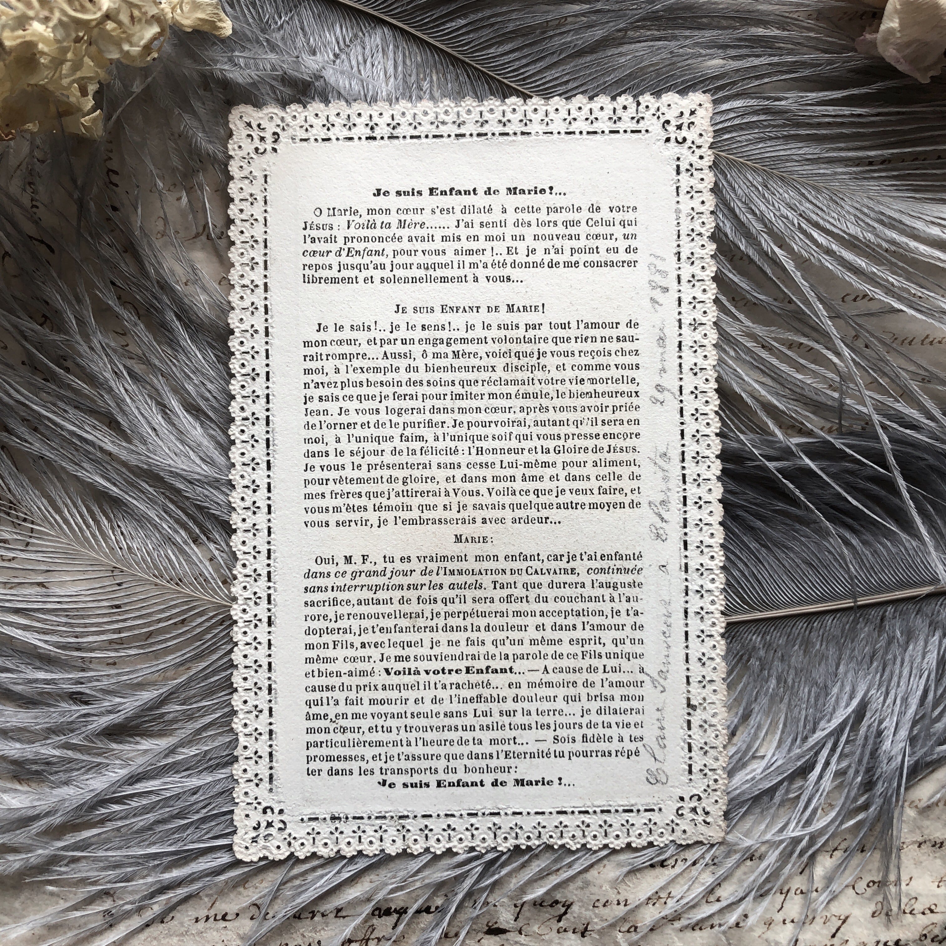 ホーリーカードの上部に"L' ENFANT DE MARIE"「マリアの子ども」とあります。グリム童話にも同名のお話があり、神に懺悔し悔い改める者は赦されるという結末なのですが、このカードにその直接の記載はないようです。ただ聖母マリアに帰依する誓いの言葉は繰り返し出てきます。光に照らされた女性の表情、影になっていますが後ろ姿が慈愛を感じさせるマリア像、見事な仕上がりの絵になっています。裏に鉛筆書きで1881年5月29日の日付があります。