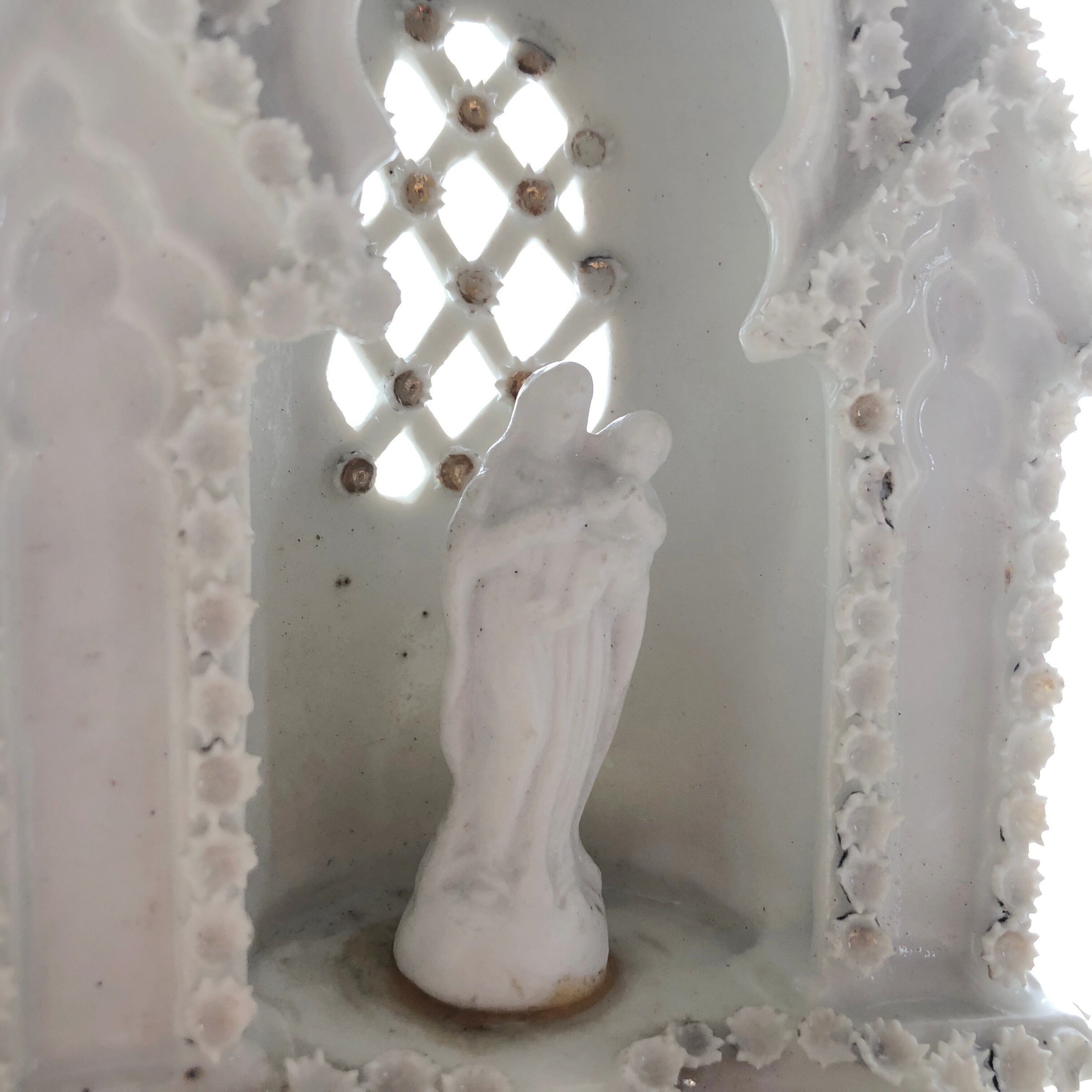花で縁取られた東屋に聖母子像を置いた、つやのある白い陶器が美しい聖水盤です。聖水盤は受け皿の水に指を浸し、その水で身を清めるものですが、こちらは一般の家庭用だったかもしれません。今だったら忘れやすい小物やアクセサリーを入れておくのもいいですね。