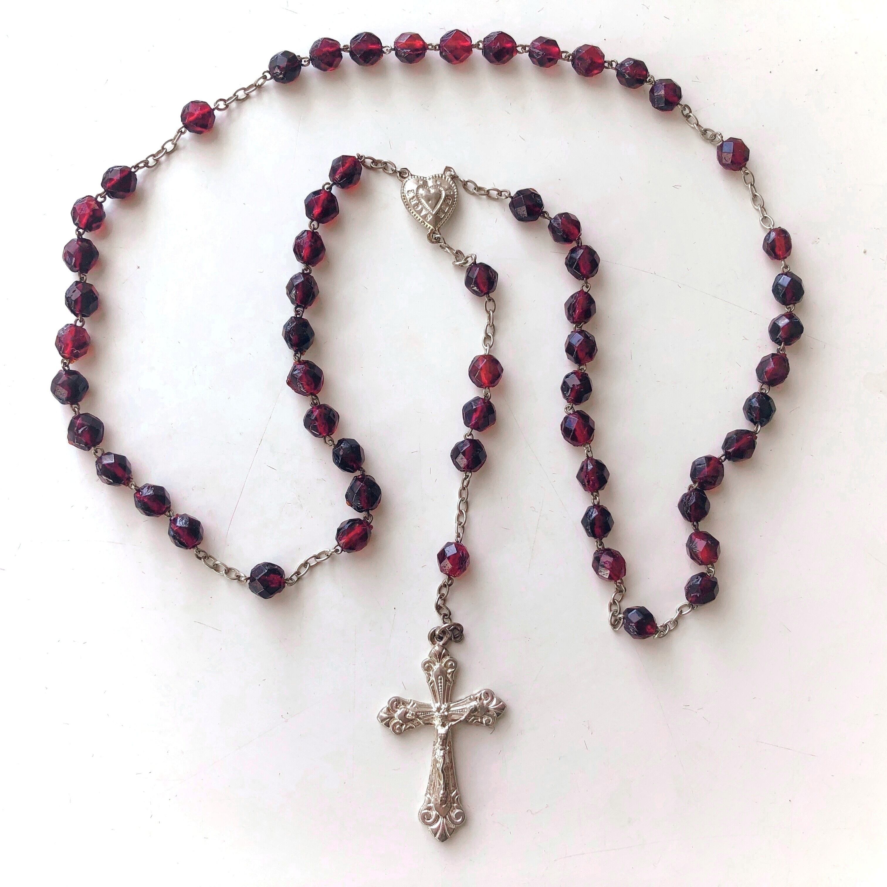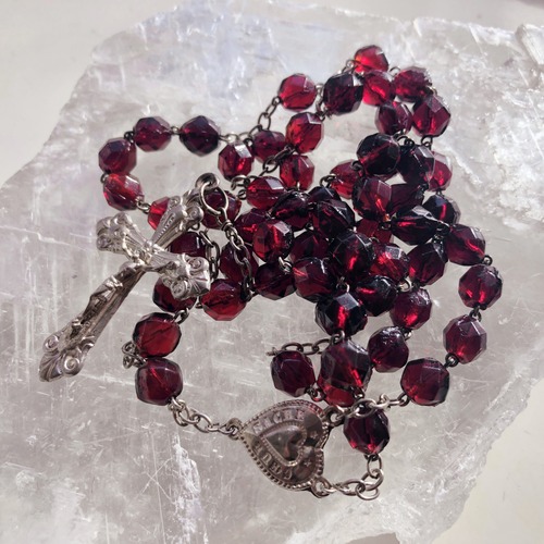 クロスは四方にフルール・ド・リスをモチーフにした装飾が施され、中途のプレートは聖心を表すハートになっています。どちらも古色を帯びていますが、きらめきを抑えた落ち着いた質感の輝きを宿し、深紅のビーズとよく合っています。