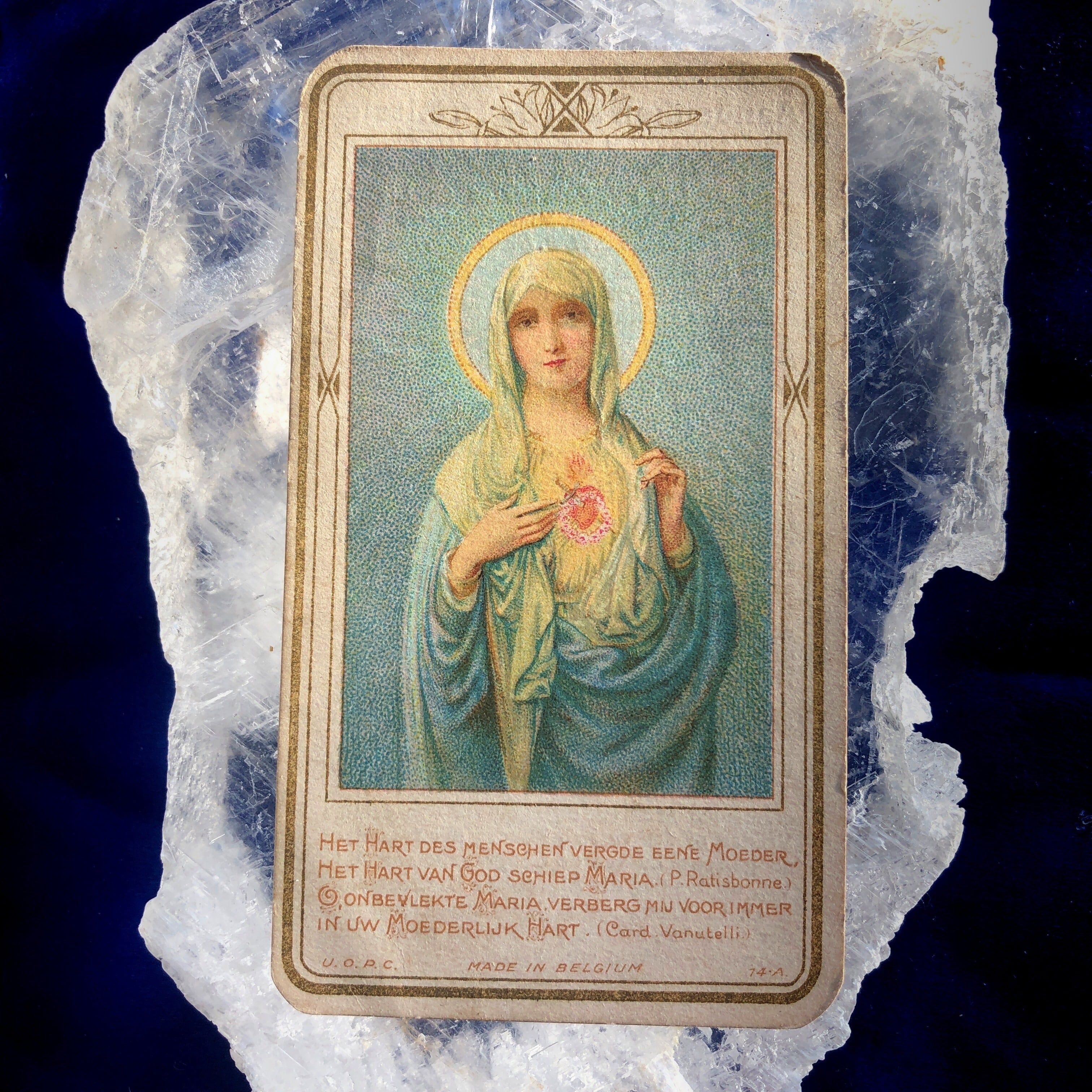 色の粒が入り混じった微妙な色彩、表情、金色の枠の意匠、ホーリーカードの全てから聖母マリアへの人々の敬愛に気持ちが伝わってきます。当時としては普通のことだったのかも知れませんが、今、改めて見るとその気持ちのこもった美しさに目を奪われます。聖母の胸には汚れなき御心を表す剣に貫かれ、花輪を捧げられながら燃える心臓が描かれています。