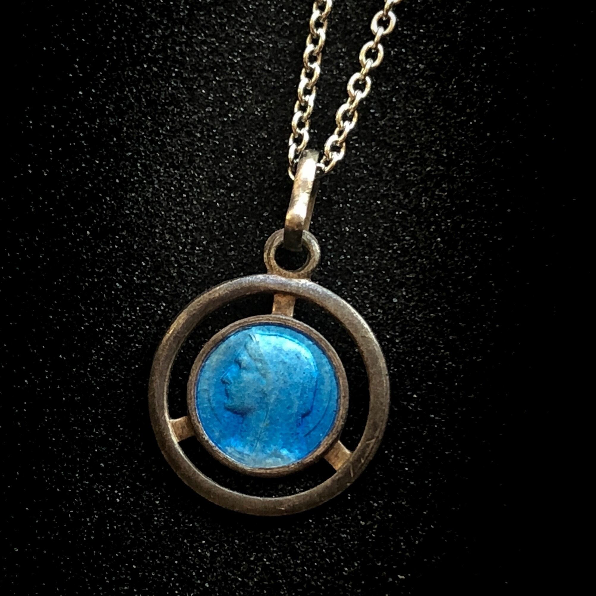 メダイはカードと同時代かもう少し後のフランス製。サイズは直径約1.2センチで、チェーンは現行品で長さが約43センチです。