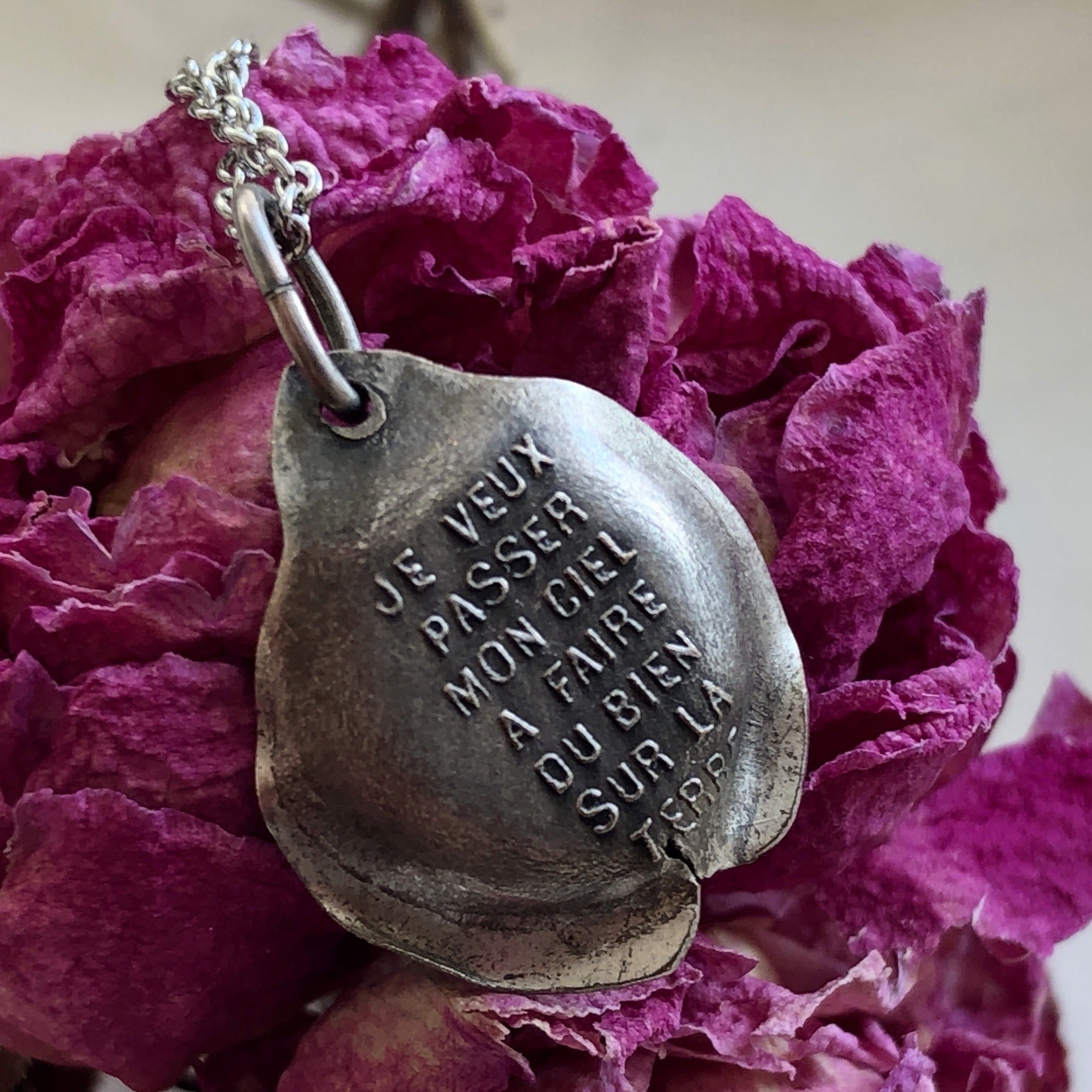 このセットのメダイ、ホーリーカードともに聖テレーズの姿と、言い残した「地上に善を為すために天で過ごす」の言葉の全文がフランス語で記されています。