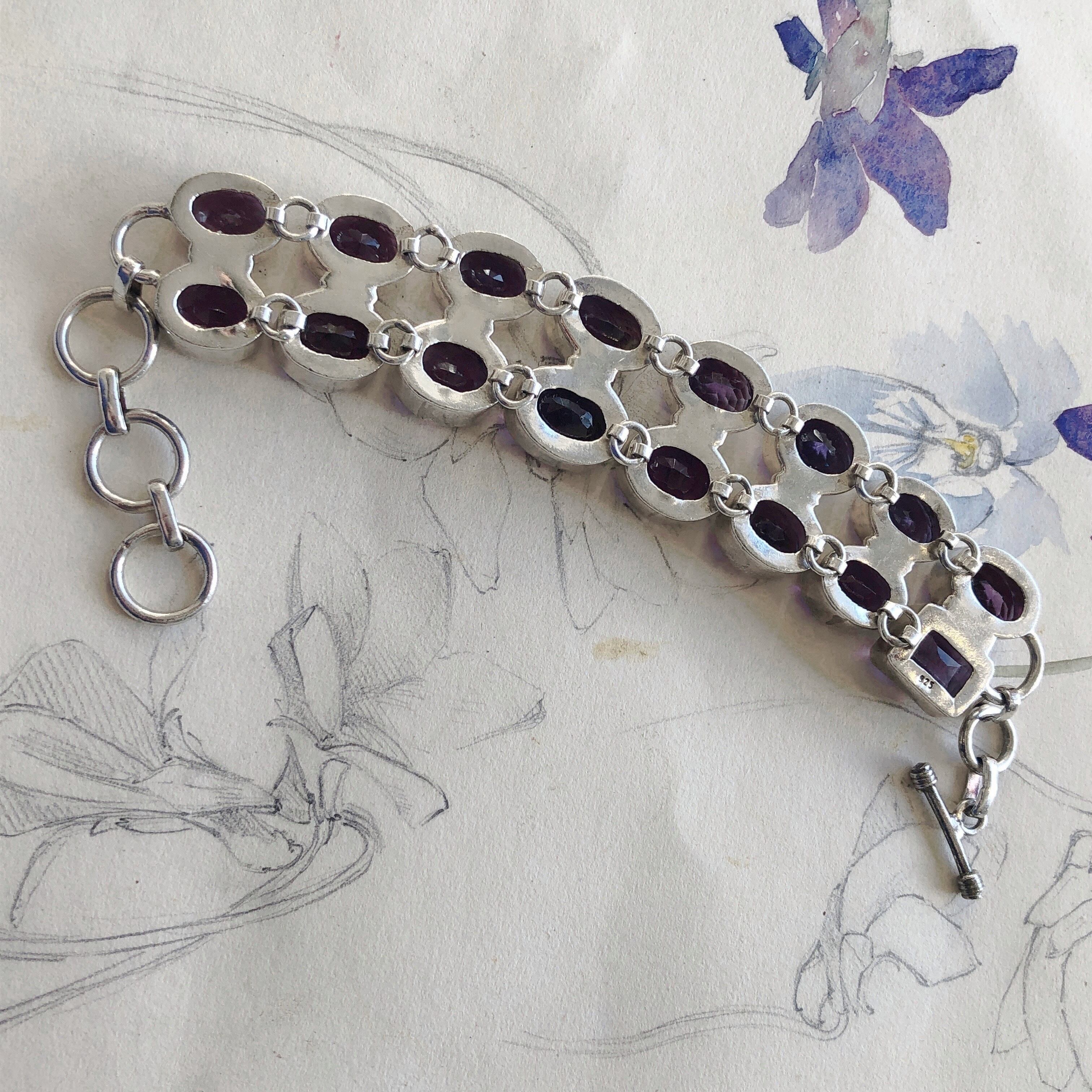 かなりヴォリュームのある大振りなブレスレットです。しかしそこにあるのは重量感ではなく、それどころか清楚な優しさが漂っています。配置されたすみれ色の粒は、売主によるとアメジストですが、鑑定はしておりません。