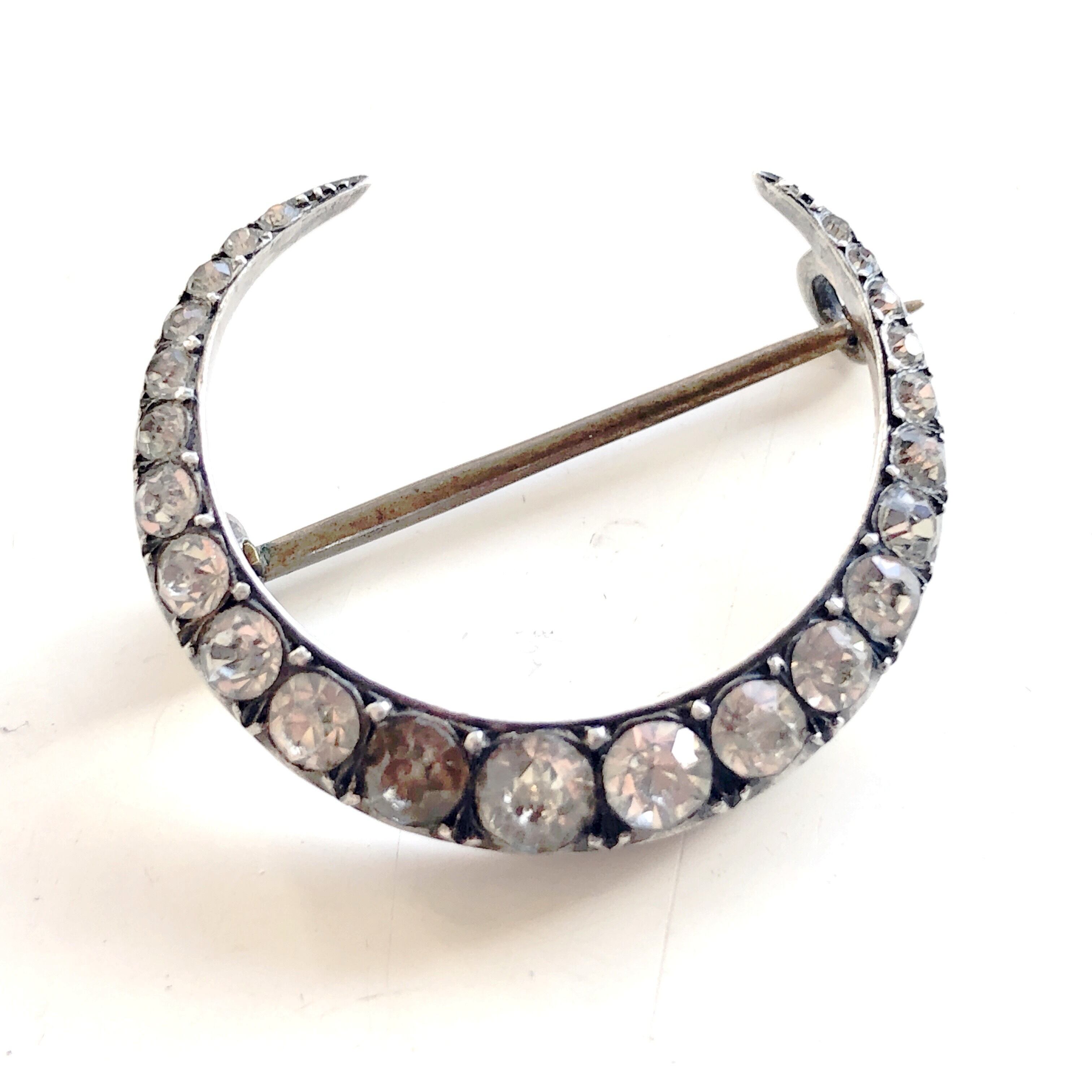 美しいペーストストーンを三日月型に配置したブローチです。ペーストストーンはクリスタルガラスを宝石のようにカットしたもので、20世紀初めの頃まではダイヤモンドの代用ともされました。ダイヤモンドほどの輝きはありませんが、このお品の落ち着いた佇まいから、一瞬、光を受けて煌めきを放つ様は、夜の闇に一筋、冴えざえと光る三日月を思わせます。不思議な事に一粒だけ、煙水晶のように黒っぽい粒があります。