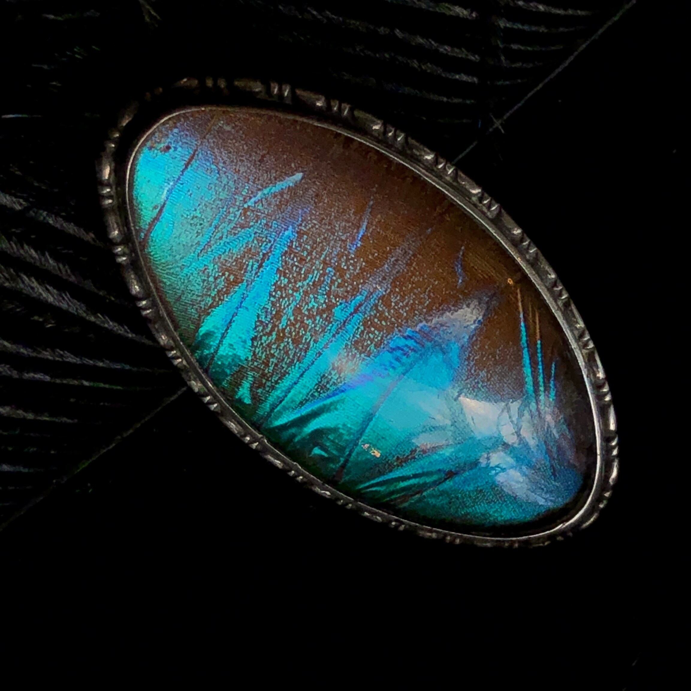 やや大振りな楕円形のモルフォ蝶のブローチです。収められた蝶の羽は、光の角度や具合でダイナミックに変化し、水色から美しく輝く青、紫がかった濃紺から黒みを帯びた濃紺まで楽しめます。また、羽の模様が不思議な立体感を生み、深い濃紺の陰と青い光が対峙する世界が現れたり、濃紺の地に輝く青が複雑な造形を創り出す瞬間もあります。