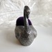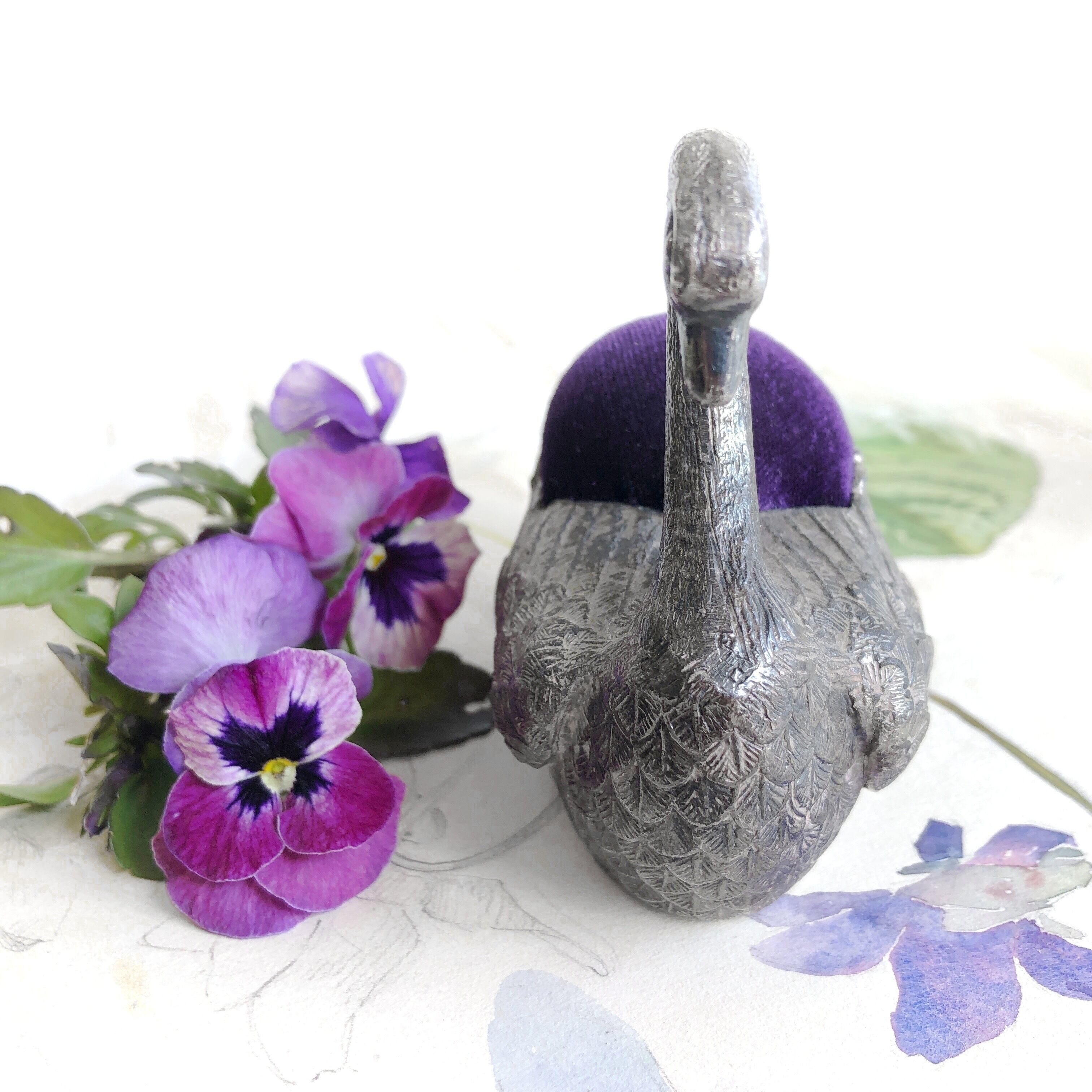 しかし、このピンクッションはどうでしょう。ハクチョウは大振りで重く、羽根などの表現も意外とリアルで細かく、目はちょっと意地悪そうにも見え、クッションは綺麗な深い紫色です。決して可愛らしいだけの姿ではありません。若い女性の手習いの道具というより、もう少し人生の経験を積んだ方の持ち物だったような気がします。「ハドソンさんにはいつも繕いものを頼むからねぇ。せめてもの感謝の気持ちだよ。」などと言いながら下宿屋の女将にでも贈られる場面が目に浮かぶようです。