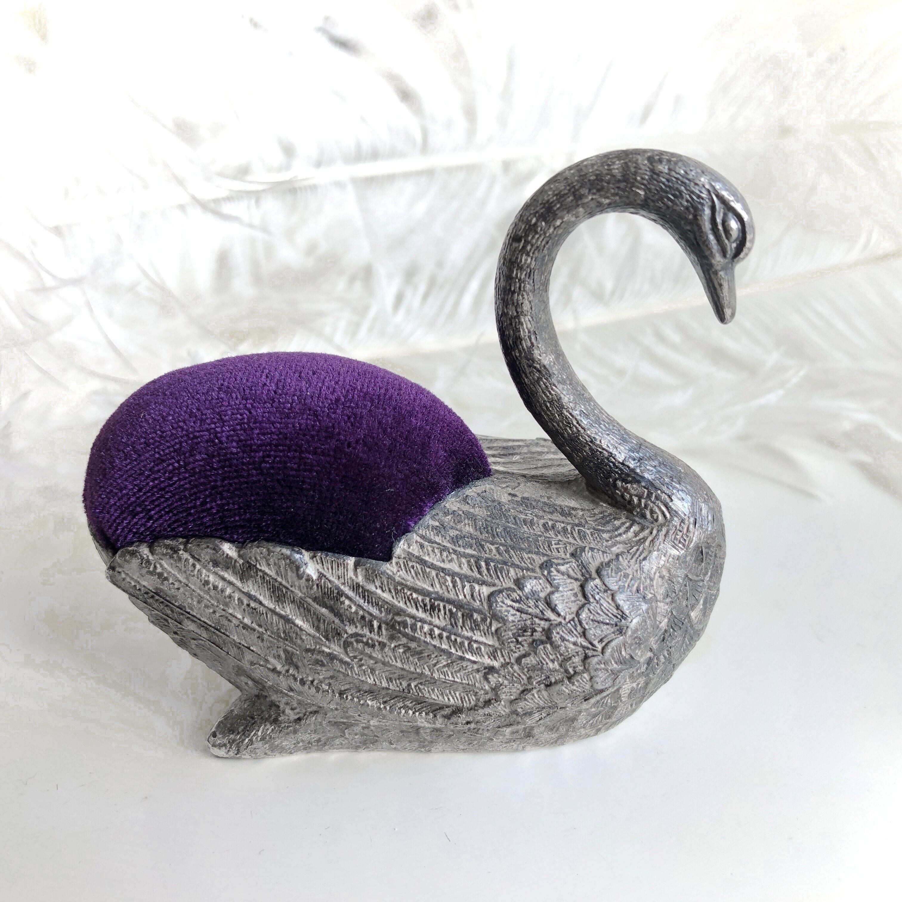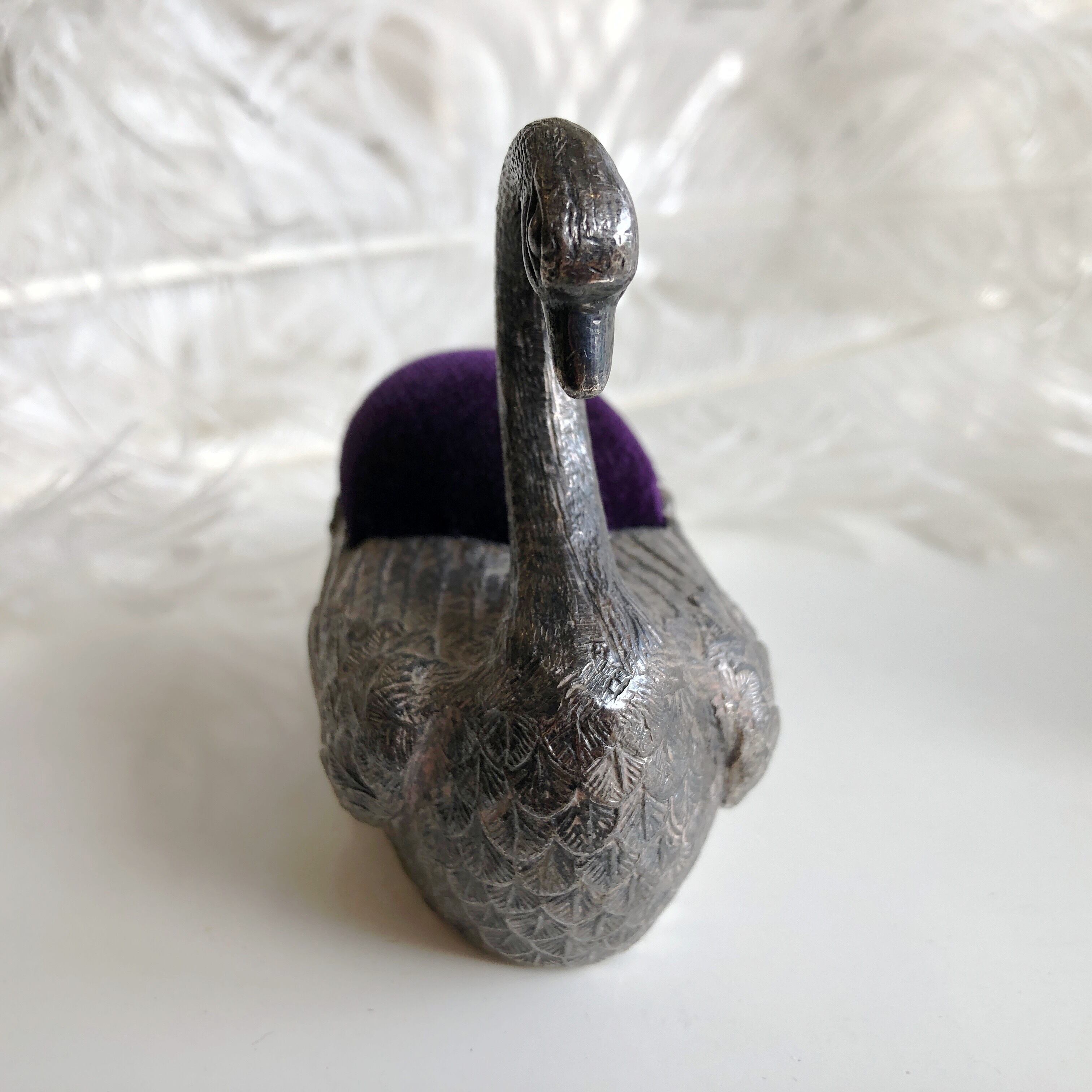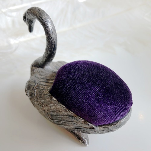 古色を帯びた銀色のハクチョウのピンクッションです。日本風に言えば「針山」でしょうか。今どきは針や糸を使う方も少なくなりましたが、かつては世の東西を問わず裁縫や縫いものは身近にあったのです。ですからこのような縫い針を刺しておくクッションもそれぞれのご家庭にあったことでしょう。