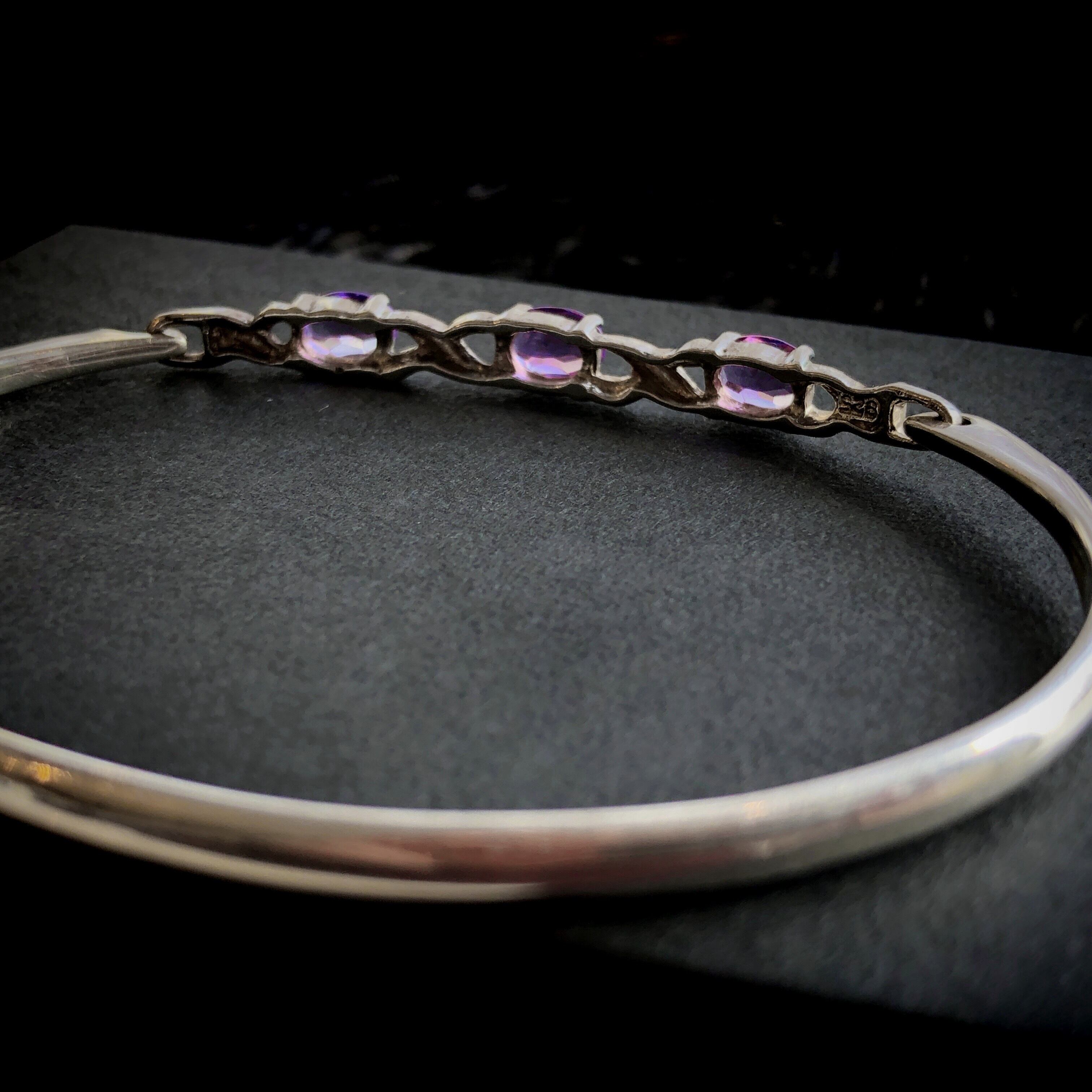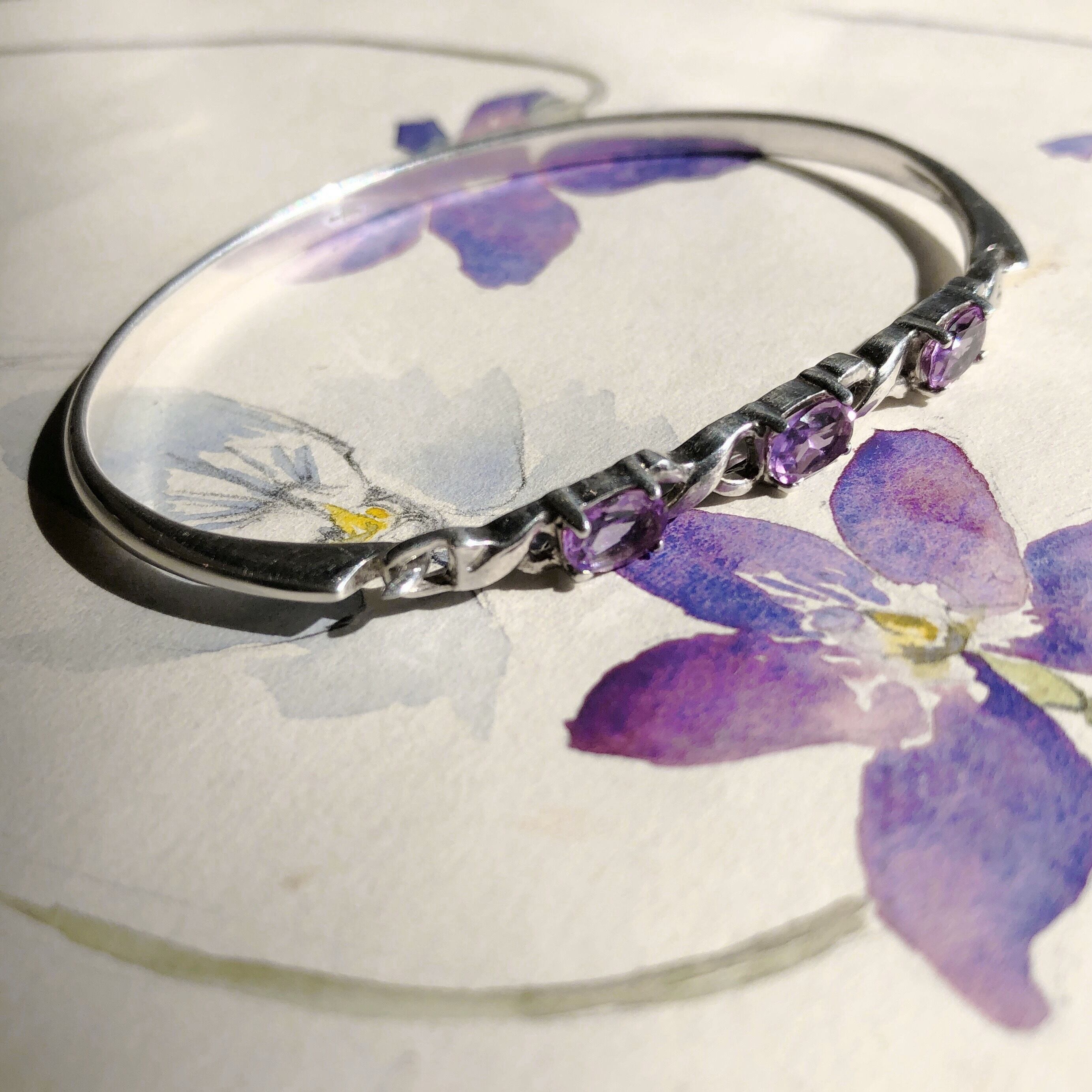 薄い紫色のカットされた石が三つ、銀の台座に置かれています。その透き通った石は清楚な輝きをまといながら、どこか儚げな風情です。