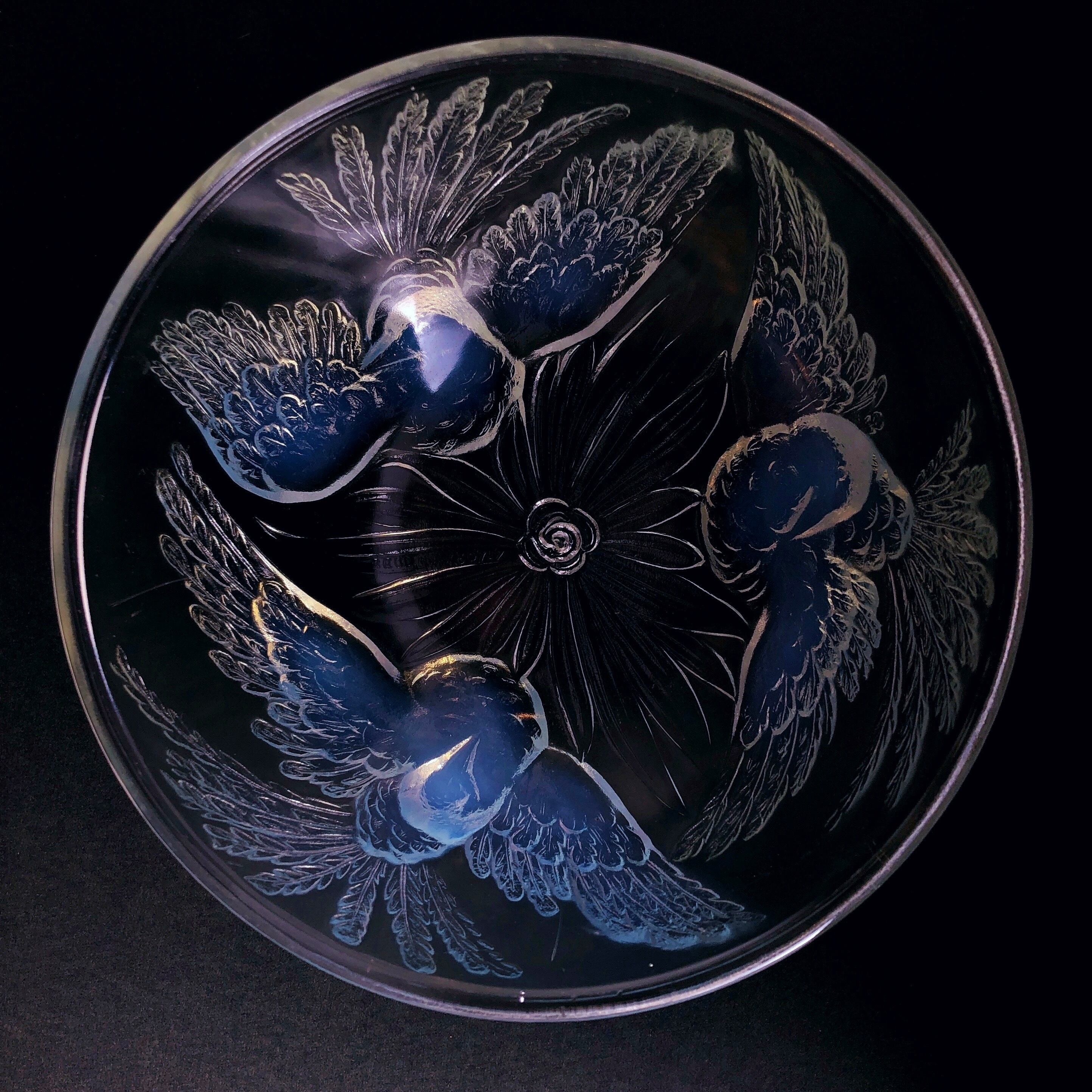 オパールセントガラスの大型のボウルです。羽を広げた三羽の鳩のレリーフがボウルの外側に生き生きと踊っています。こちらのお品はオパールセントガラス独特のアプリコットの遊色はごく控えめで、比較的透明度が高く、レリーフも厚く浮き彫りにされているため、内側から見ると躍動する鳩たちが青白く縁取られ、ほんのりと遊色に染まります。それが光の角度によって、ガラスを通す光の煌めきとも相まって様々な表情を見せます。