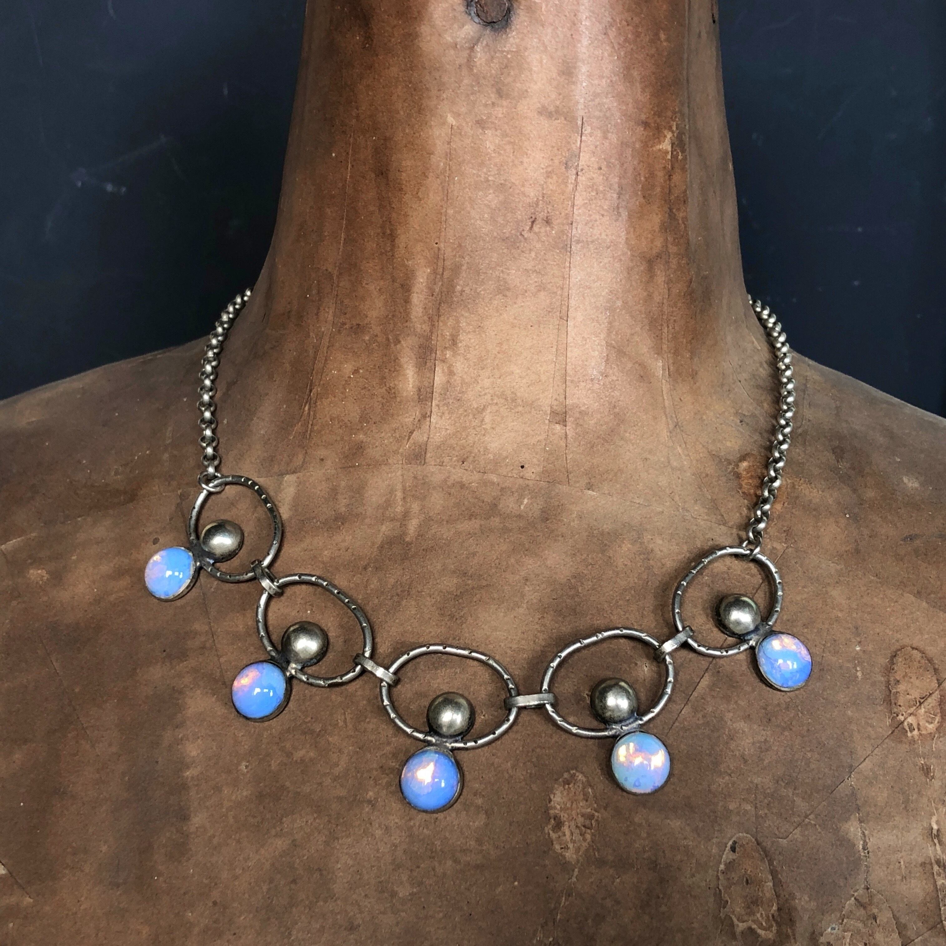 とても艶やかで瑞々しいオパールセントガラスの首飾りです。綺麗に磨かれ、しっとりと落ち着いた佇まいの青白い半球の中を淡いアプリコットの光が踊ります。その輝きは光の加減や角度でまさに変幻自在。あるときは青白い球の端に一粒キラリと現れ、またあるときは動きとともに移動し、また複雑な造形が球を染めて拡がる幻想的な表情にもなります。それはまさに捉えようとして果たせない、現れては消える悪戯な妖精のようです。