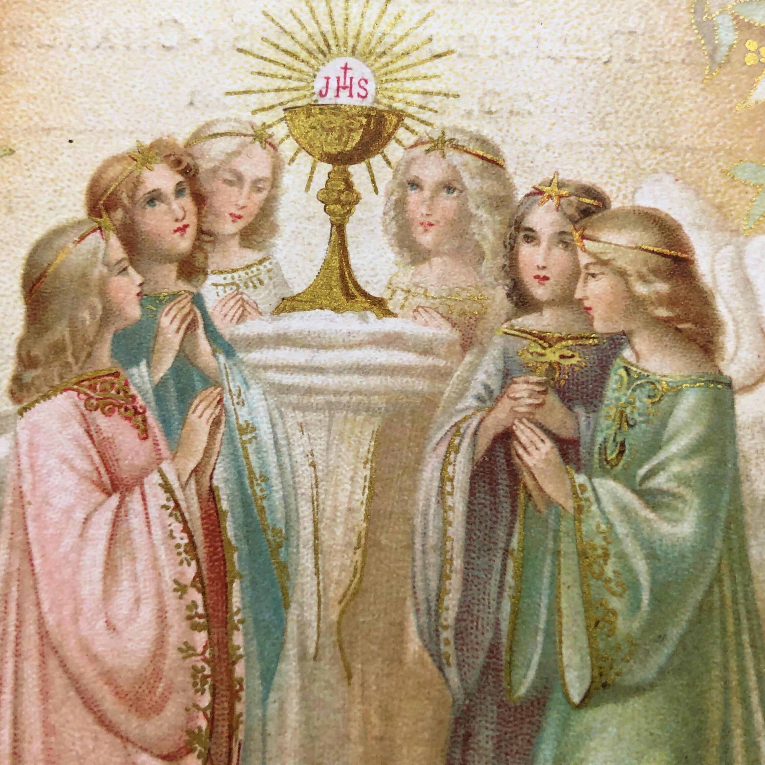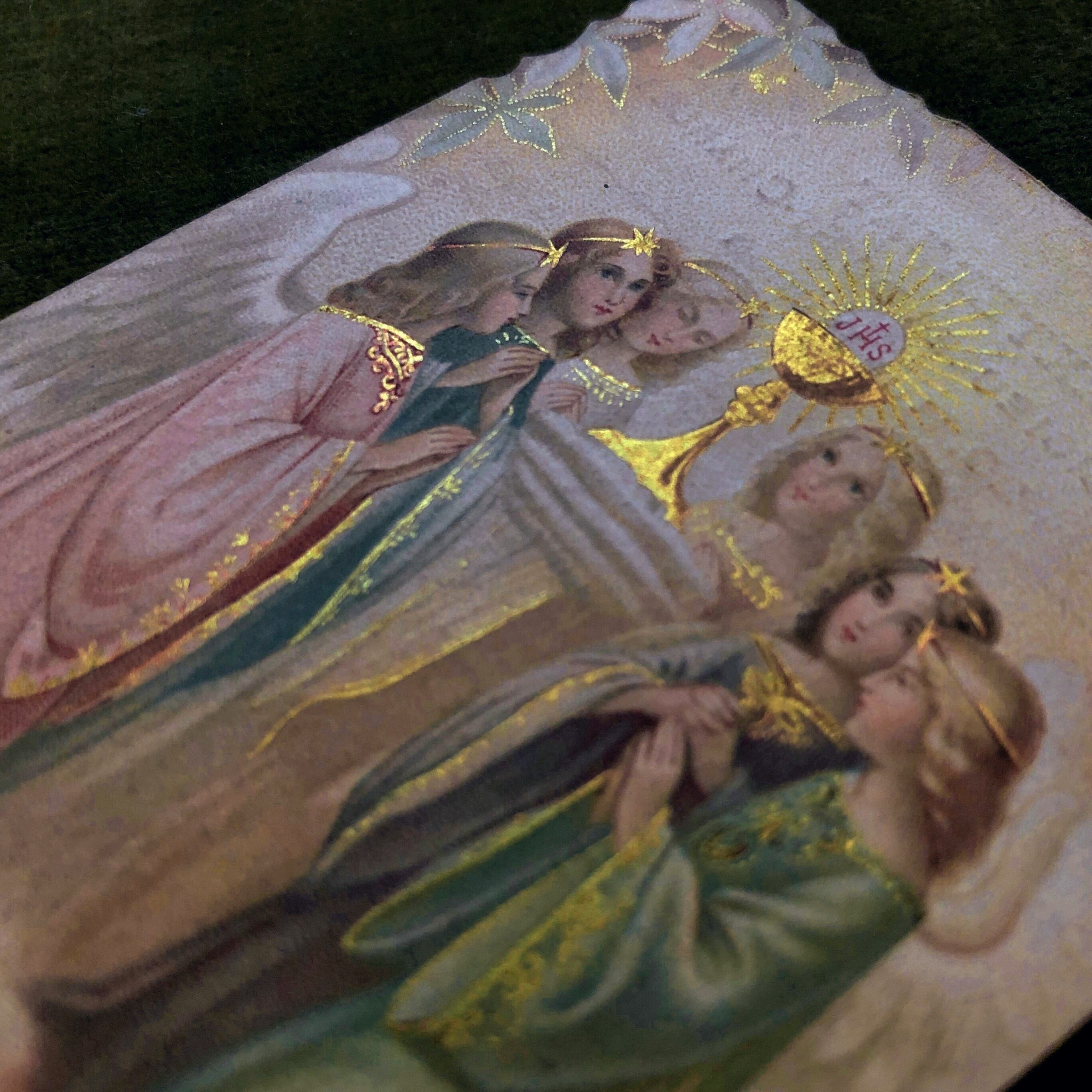 合わせたホーリーカードは6人の天使が聖杯の周りに集まり、淡い色調と金色の彩色が暖かく祝福された美しさを見せています。こちらはサン・シャルル女子修道院学校とでも訳せばよいのでしょうか、同じ学校に通っている女子生徒9人が聖体拝領を受けた記念のカードなのです。裏に1902年5月4日の日付とともに彼女たちの名前が記されています。