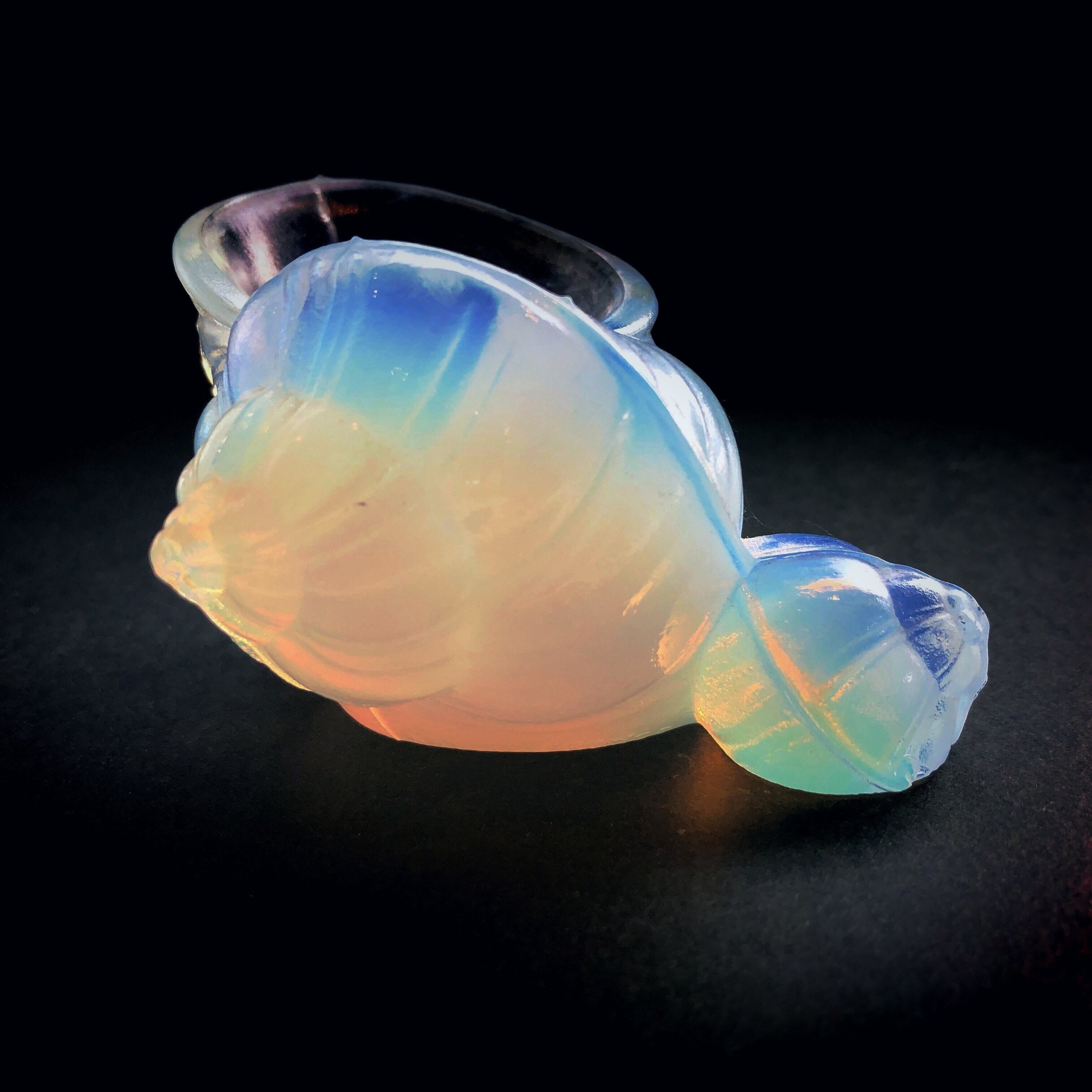 大小のエスカルゴが3つ、大きい方の口はちょっと何かを入れておくのによさそうです。オパールセントガラスは柔らかい質感で、光を浴びるとアプリコットの遊色を浮かべるのですが、このお品の青白く瑞々しいガラスには程よい透明感もあり、優雅な曲線を描く貝の体内に薄いアプリコットの光をたっぷりと含んで、濃淡、様々な景色を創り出します。