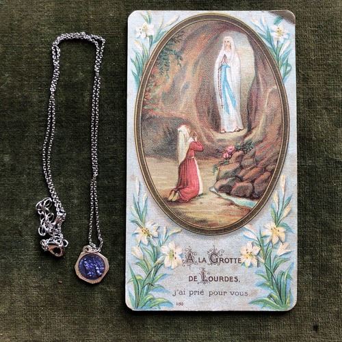 こちらのメダイは聖母マリアの横顔と、ルルドの洞窟でベルナデッタがマリア様と出会う場面が表裏に浮き彫りにされています。洞窟の中はほんのりと青く、こんな小さい中によくぞと思う細工です。