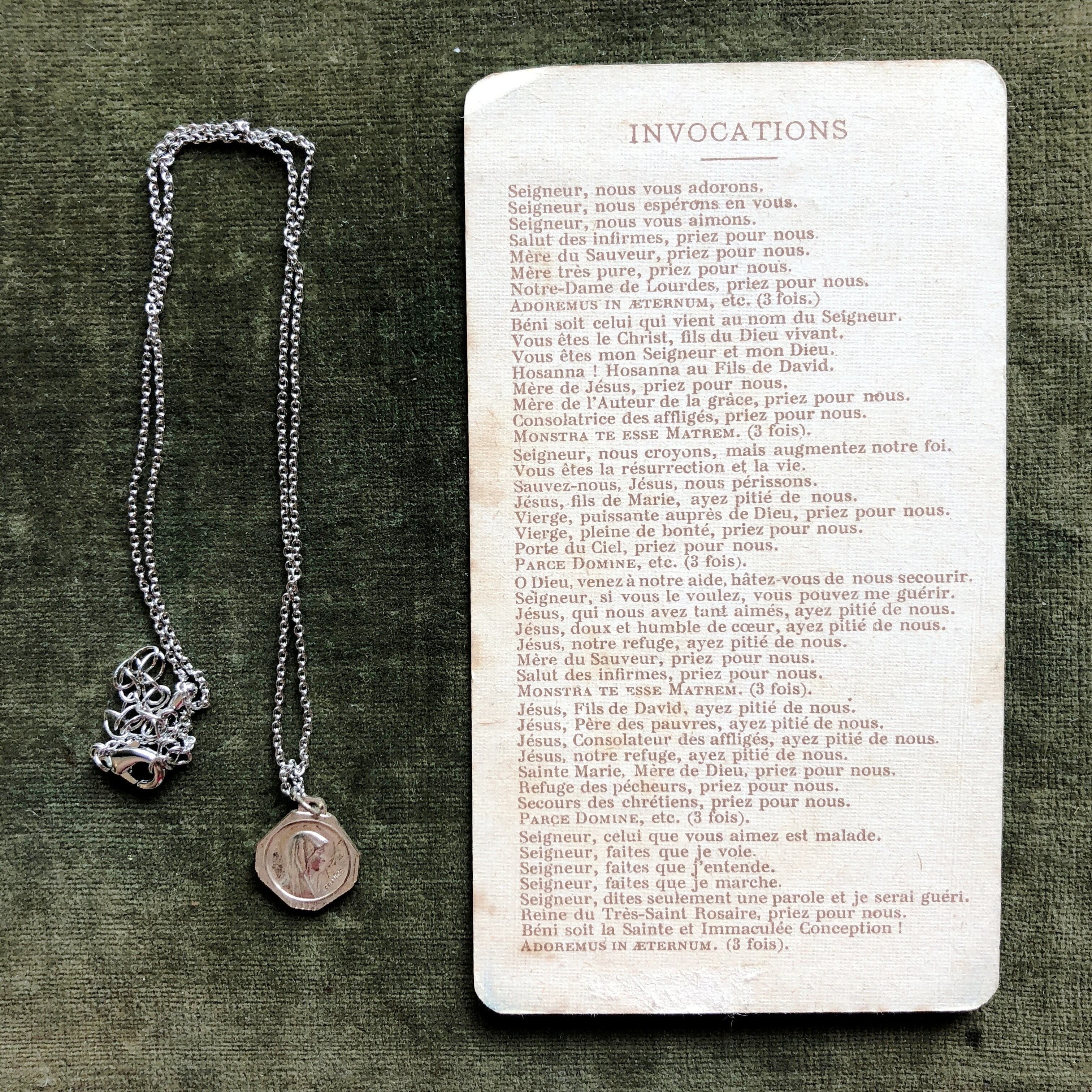 メダイ、カードともに19世紀から20世紀初め頃のフランス製。サイズはメダイが直径約1.1センチ、チェーンは現行品で長さが約43センチで、カードは約6.4×11.3センチです。
