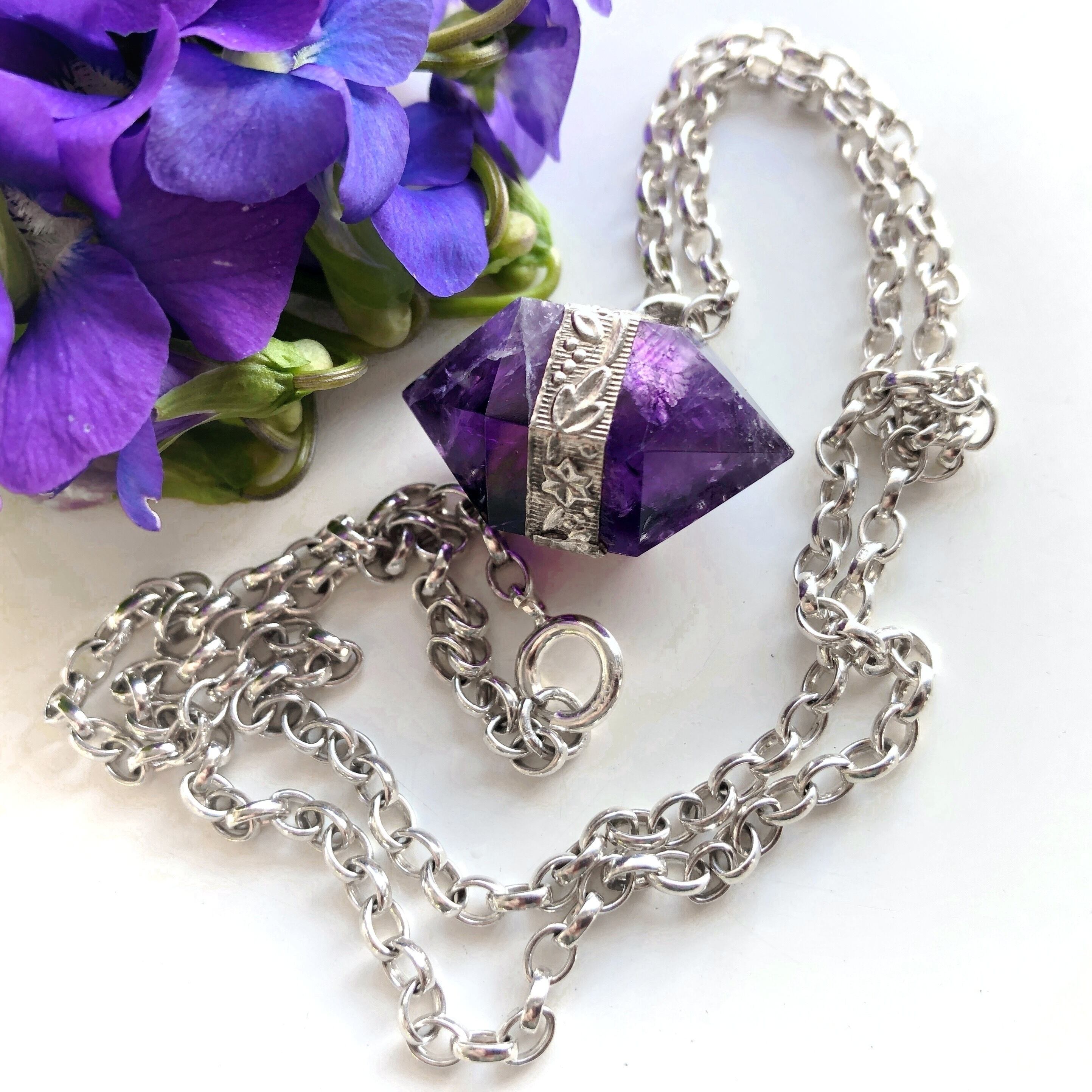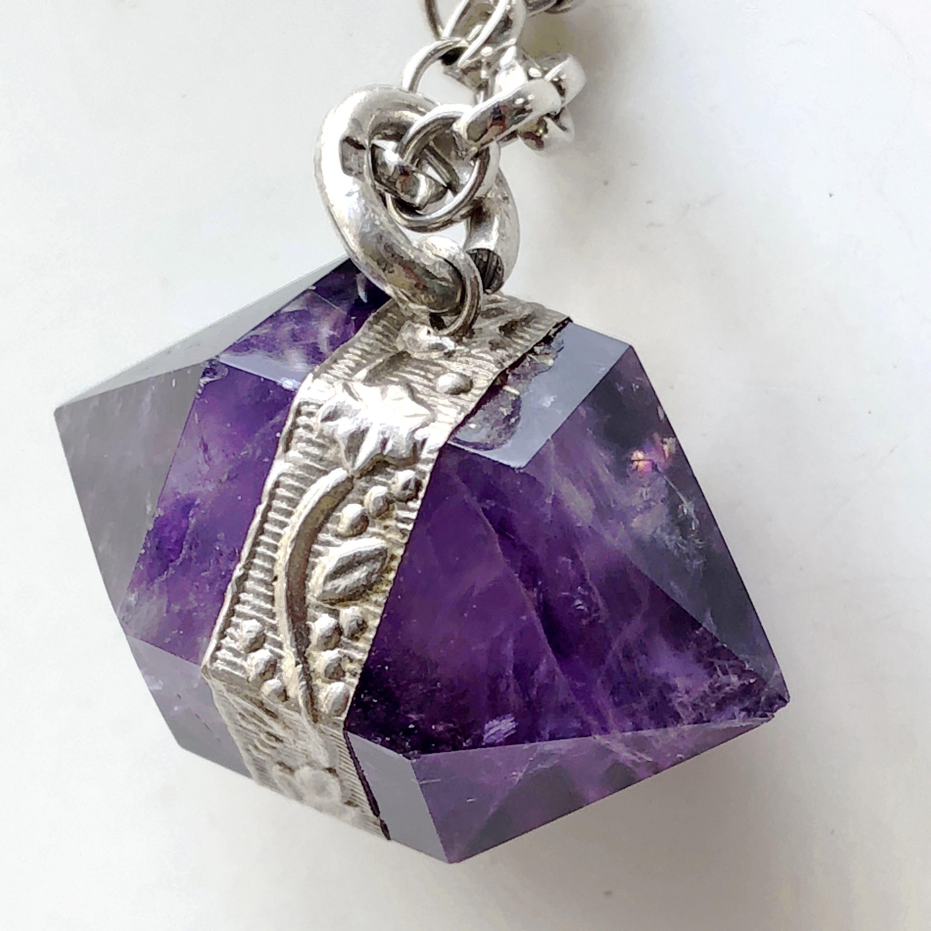カットされた一粒のアメジストに銀の帯があしらわれたペンダントです。