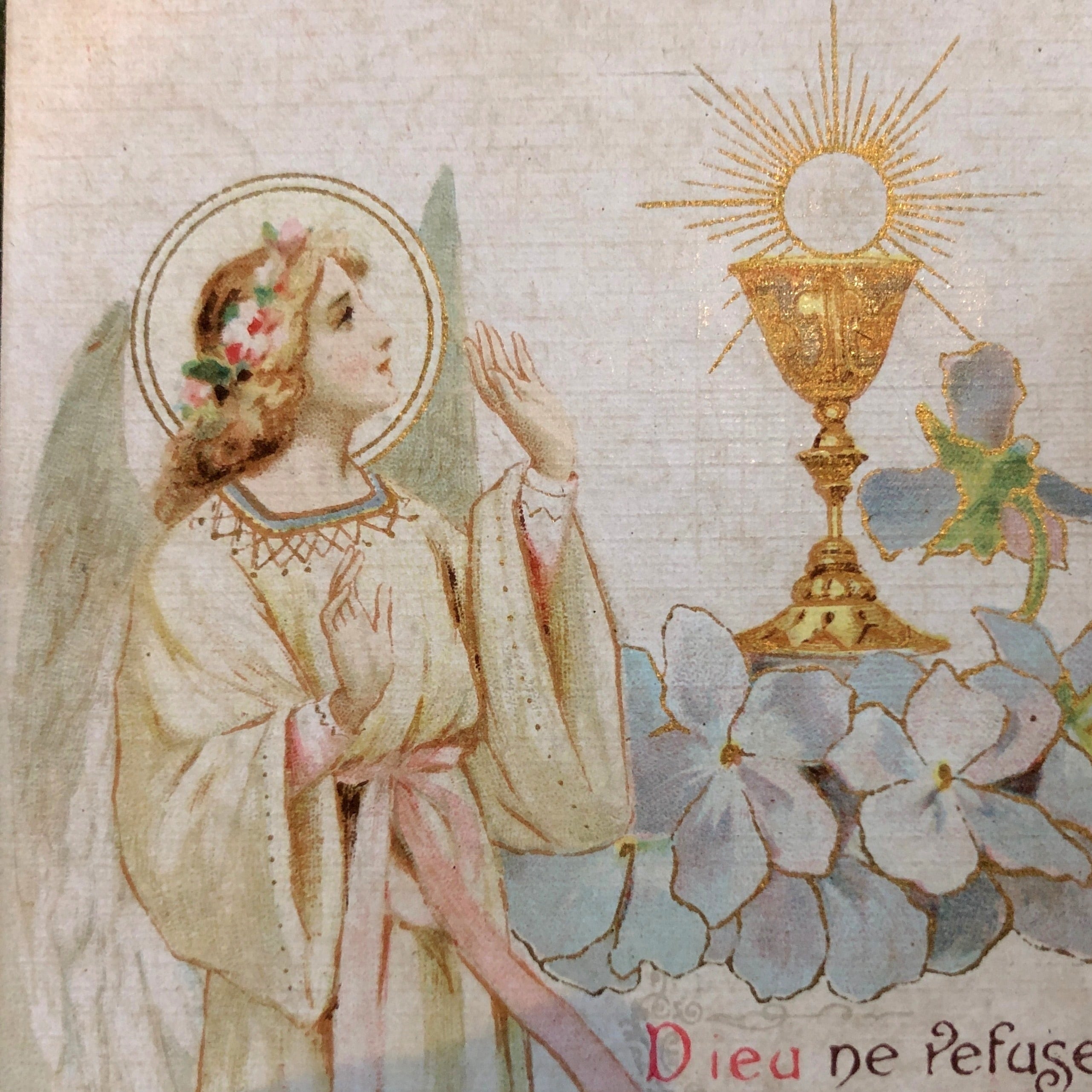 それに聖杯と天使のホーリーカードを合わせました。淡い彩色に金色をあしらった優しくも美しいカードです。聖杯はイエス・キリストの聖体をいただく杯であり、その光を見上げる天使の顔にも尊いものを敬う表情が現れています。「求めよさらば与えられん。」という言葉があり、これは聖体拝領を記念するカードと思われます。